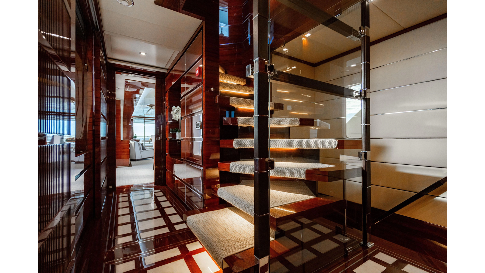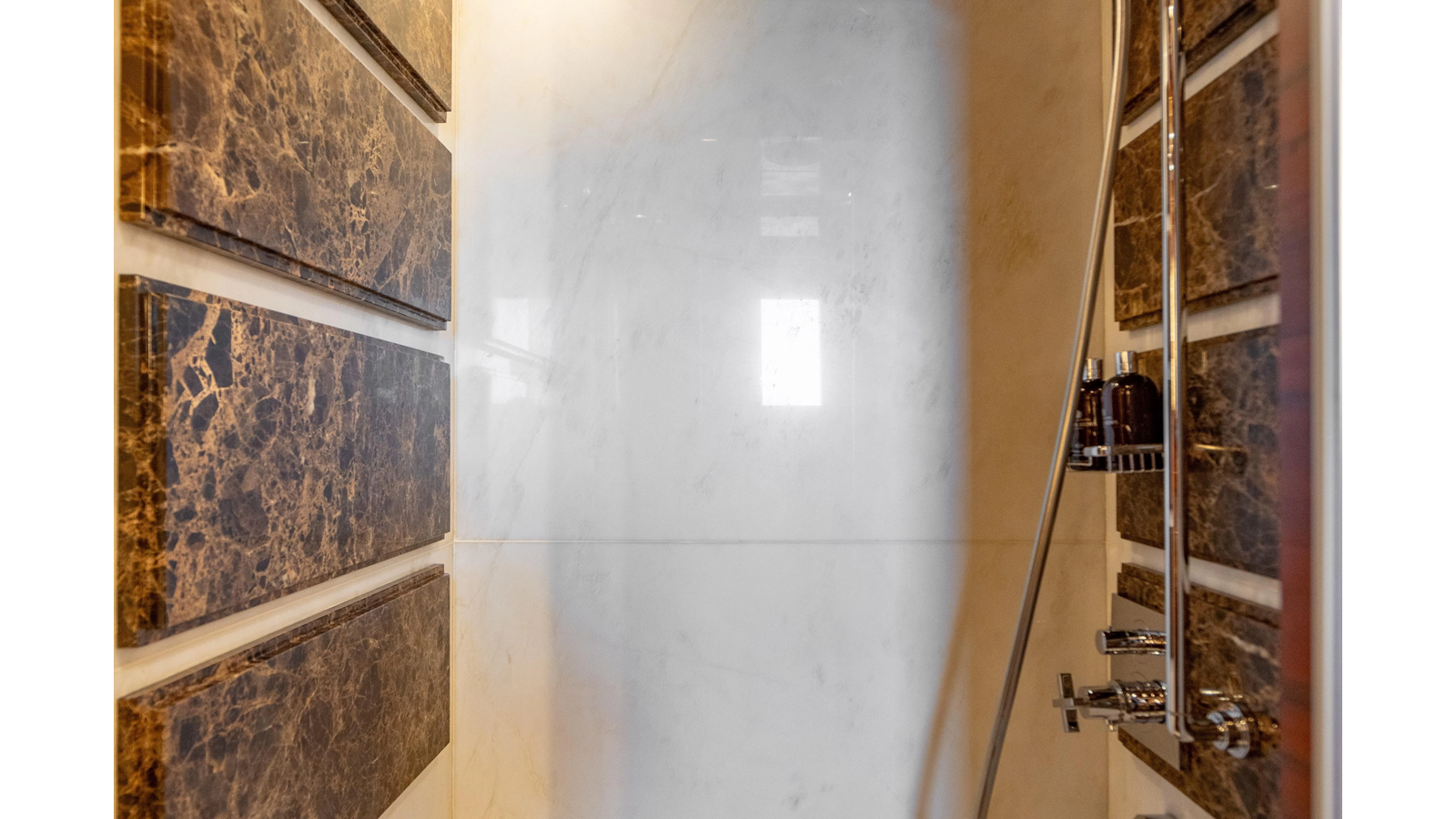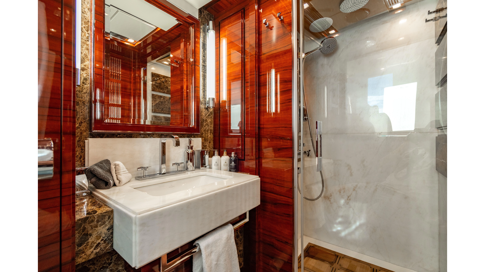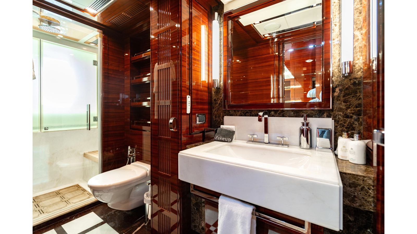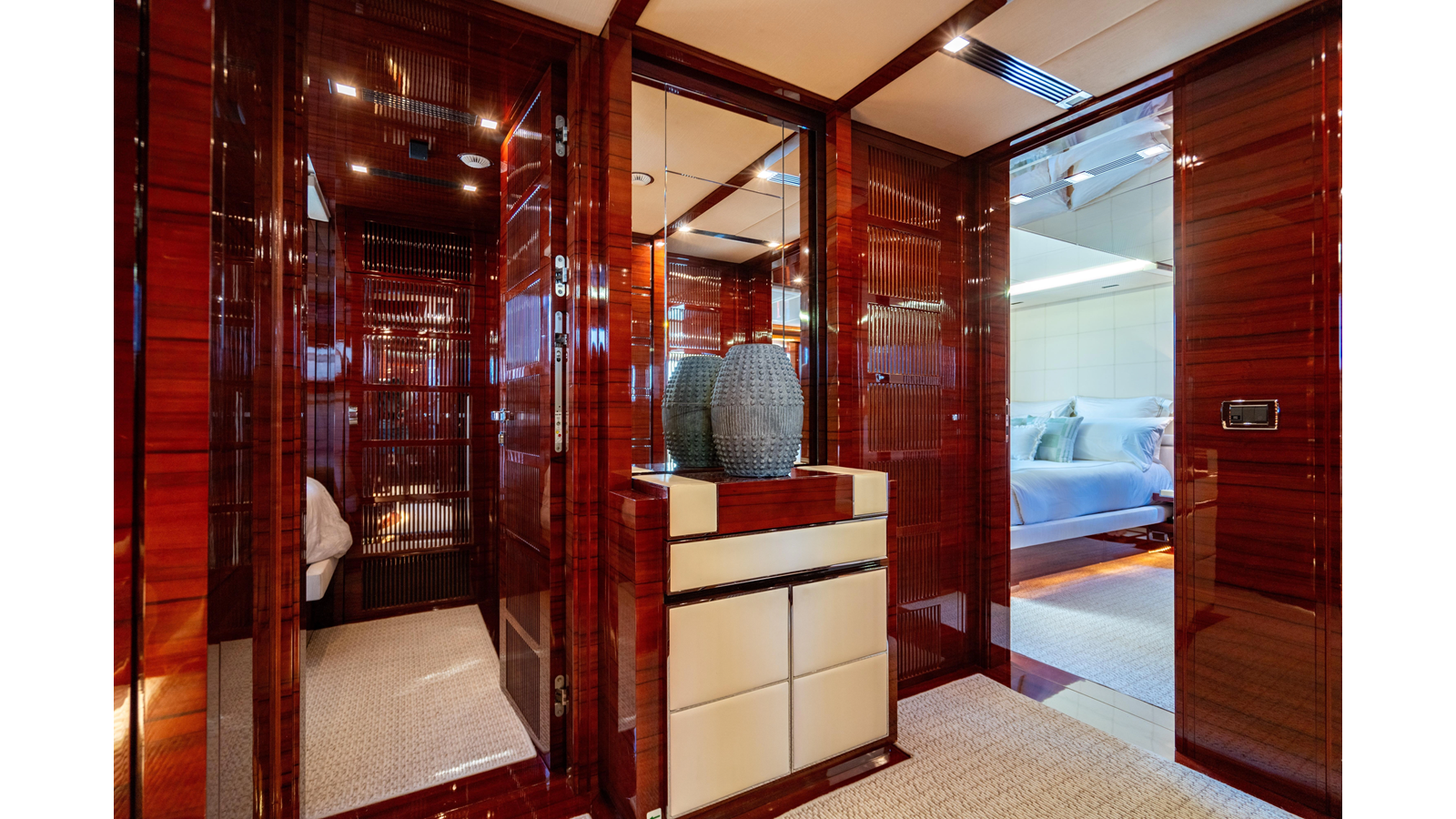 The interior was further updated in 2022/2023 to a more modern décor by Patrick Knowles at a cost of approximately $2 million. Interior soft goods, blinds, and furniture were replaced, and the pilothouse navigation system was upgraded to Garmin electronics, featuring five 22-inch Garmin screens and an additional 10-inch GPS unit with monitoring in the captain’s cabin and crew area.