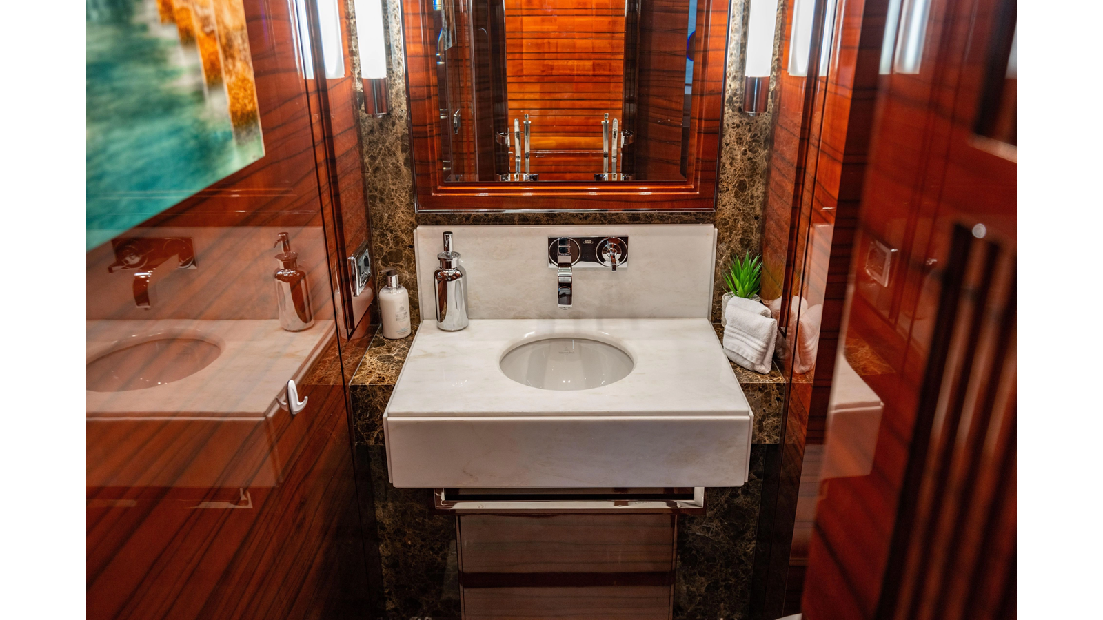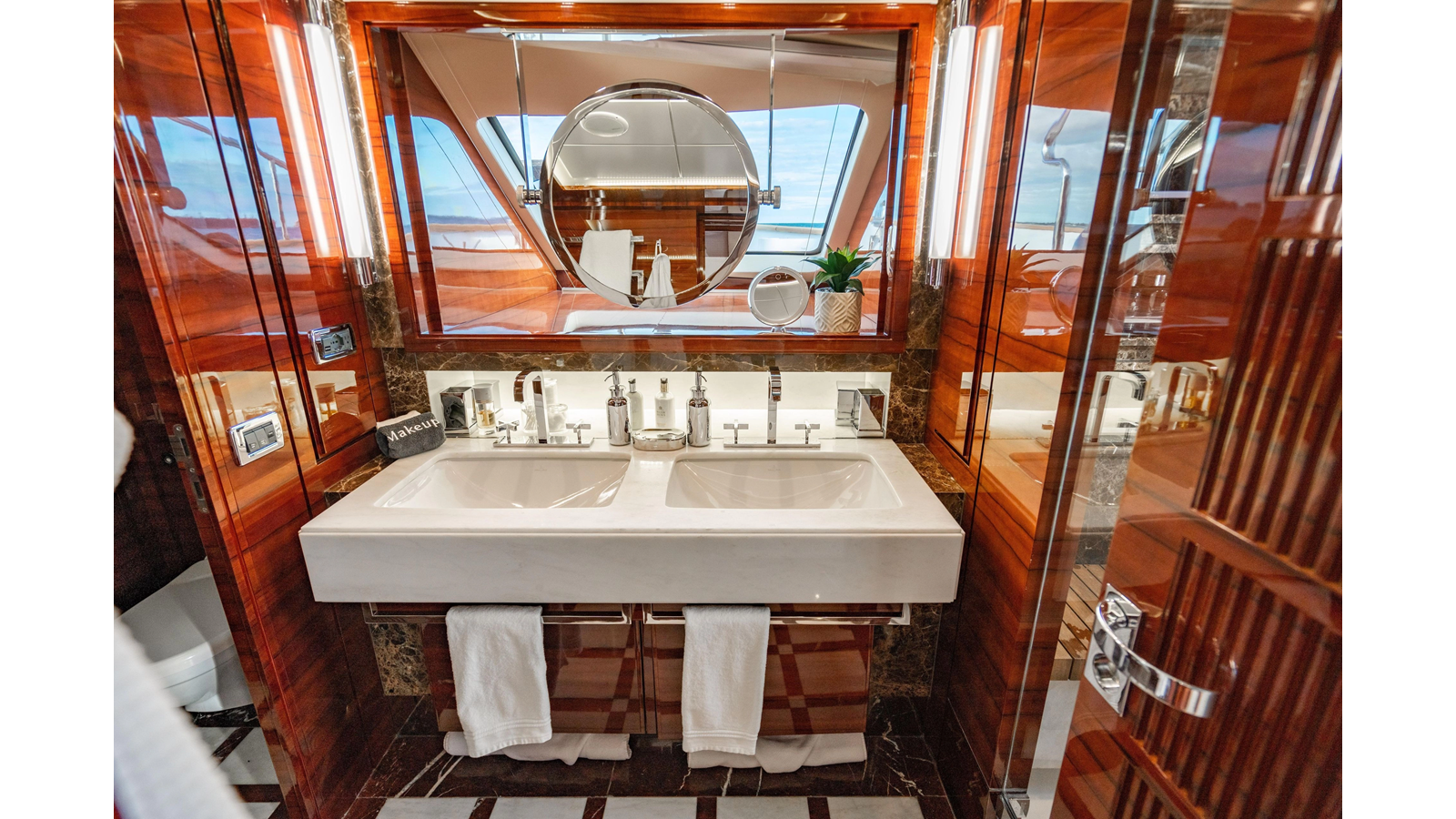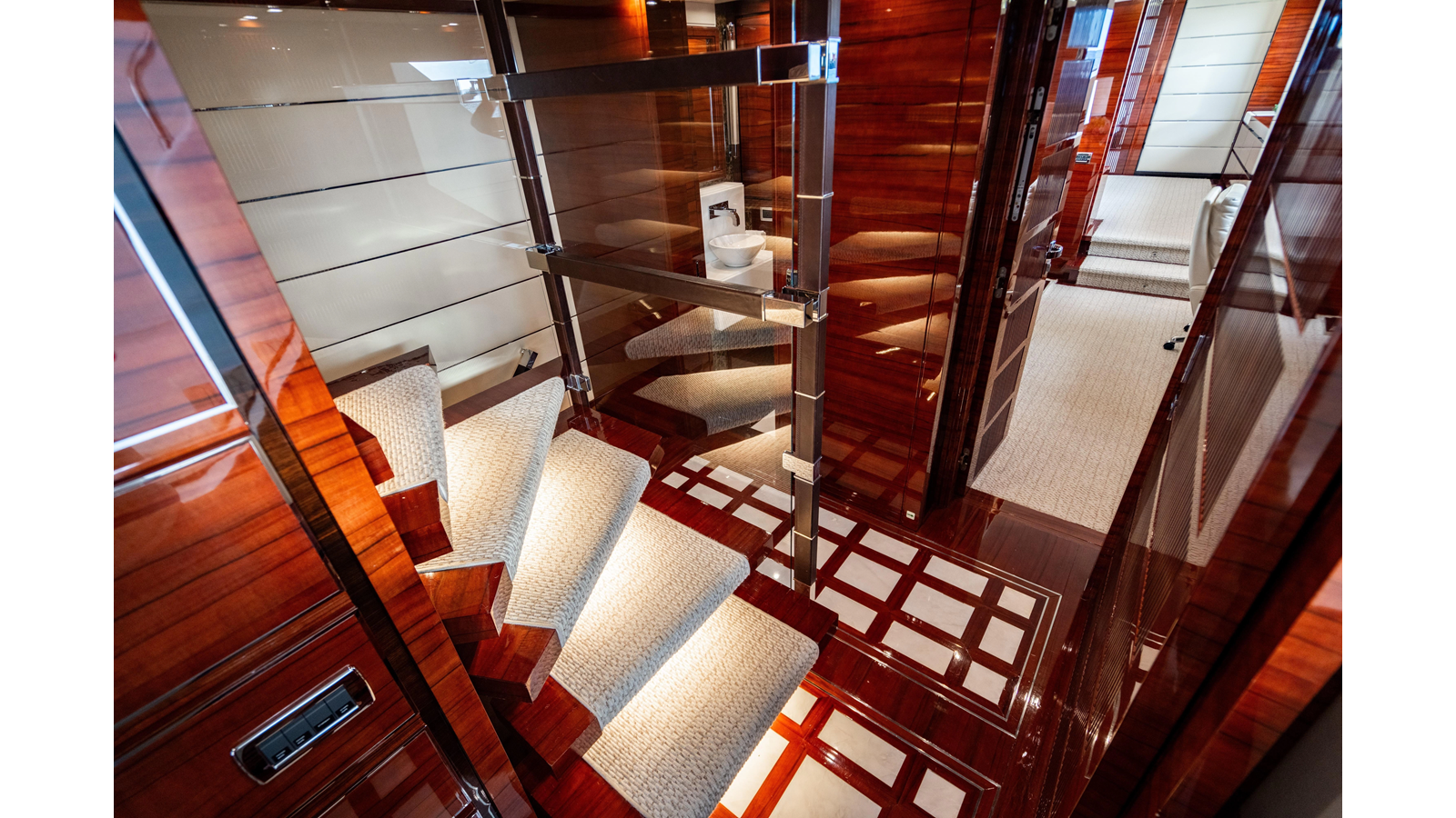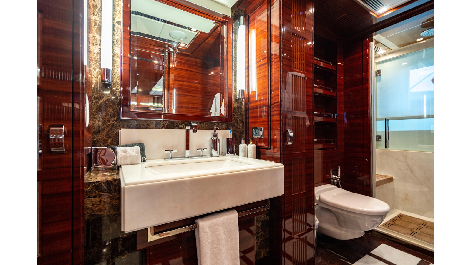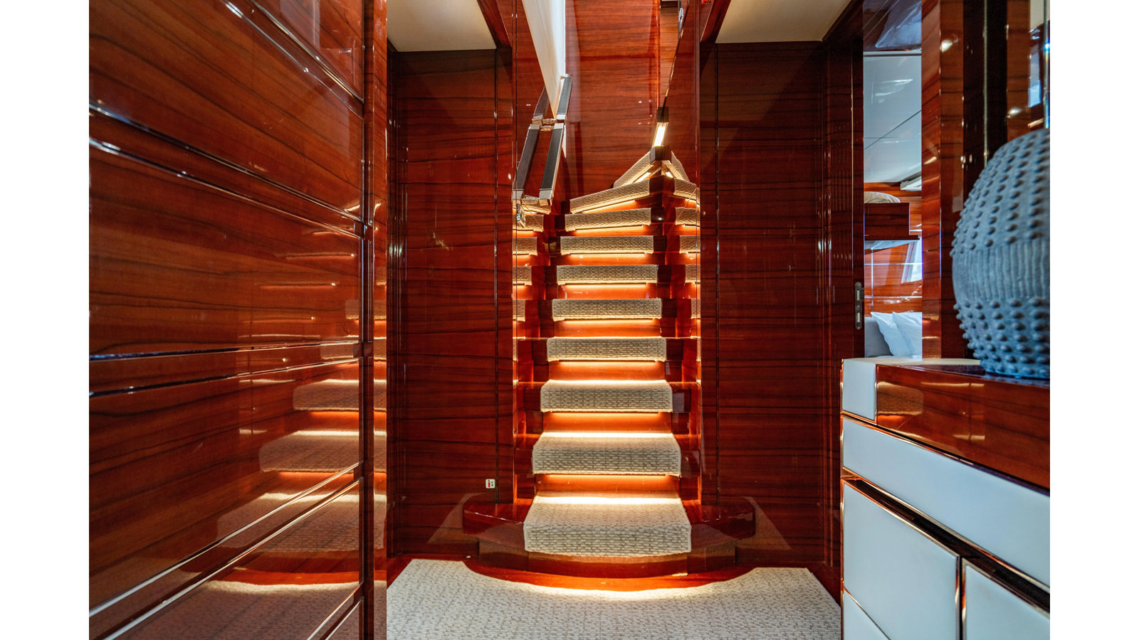 The interior was further updated in 2022/2023 to a more modern décor by Patrick Knowles at a cost of approximately $2 million. Interior soft goods, blinds, and furniture were replaced, and the pilothouse navigation system was upgraded to Garmin electronics, featuring five 22-inch Garmin screens and an additional 10-inch GPS unit with monitoring in the captain’s cabin and crew area.