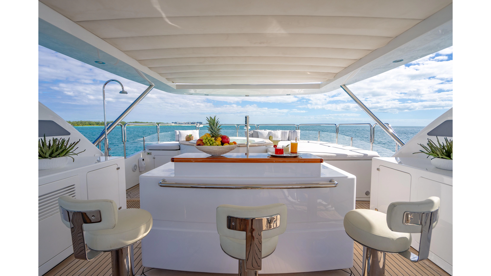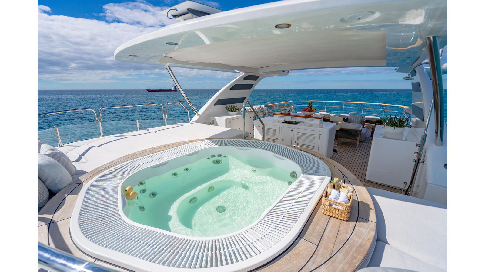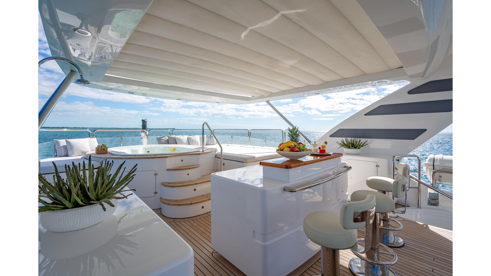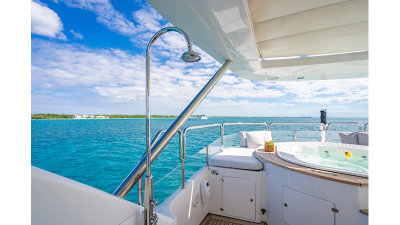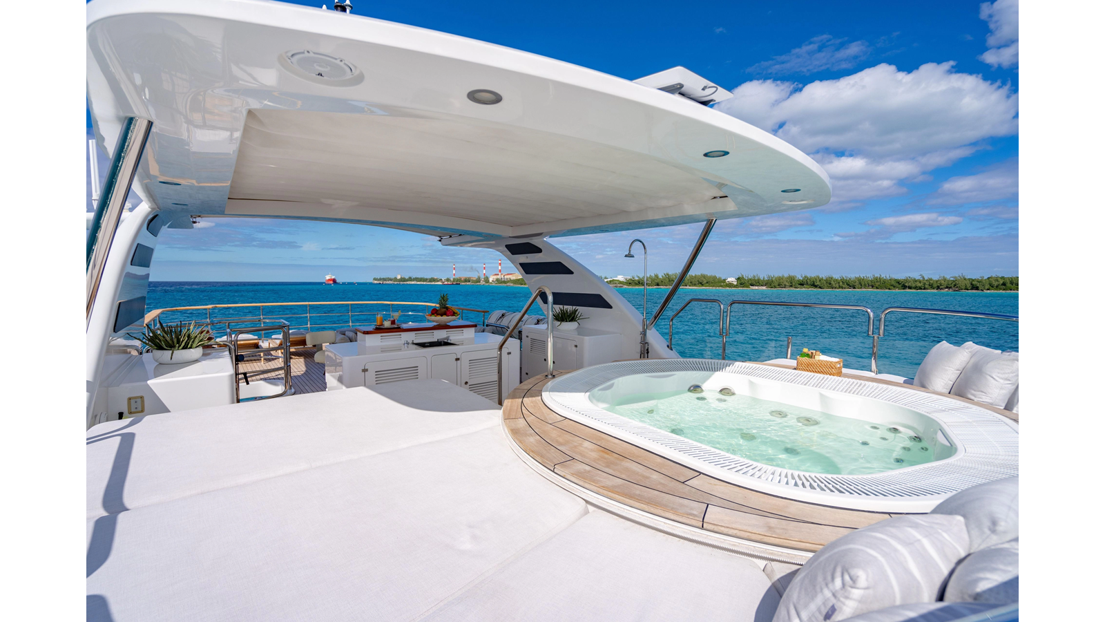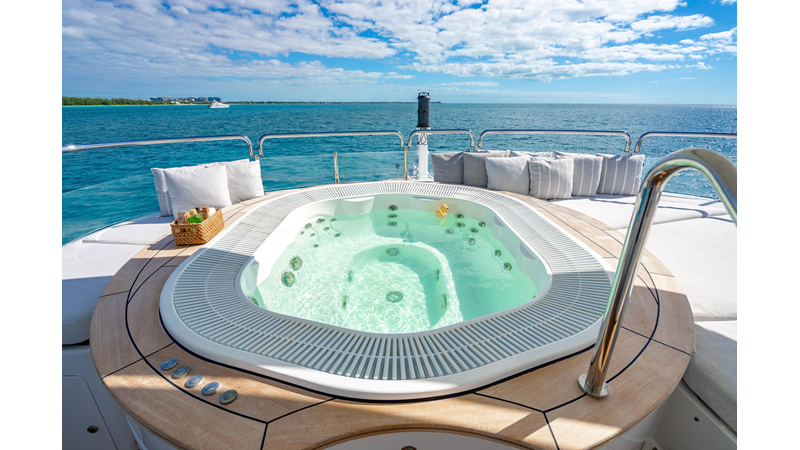 Factory upgrades include a custom dinette in the galley (which could be redesigned for additional space if desired) and a custom hardtop with a removable shade in the aft section, allowing for both shade or sun, along with an opening roof over the bar and Jacuzzi.