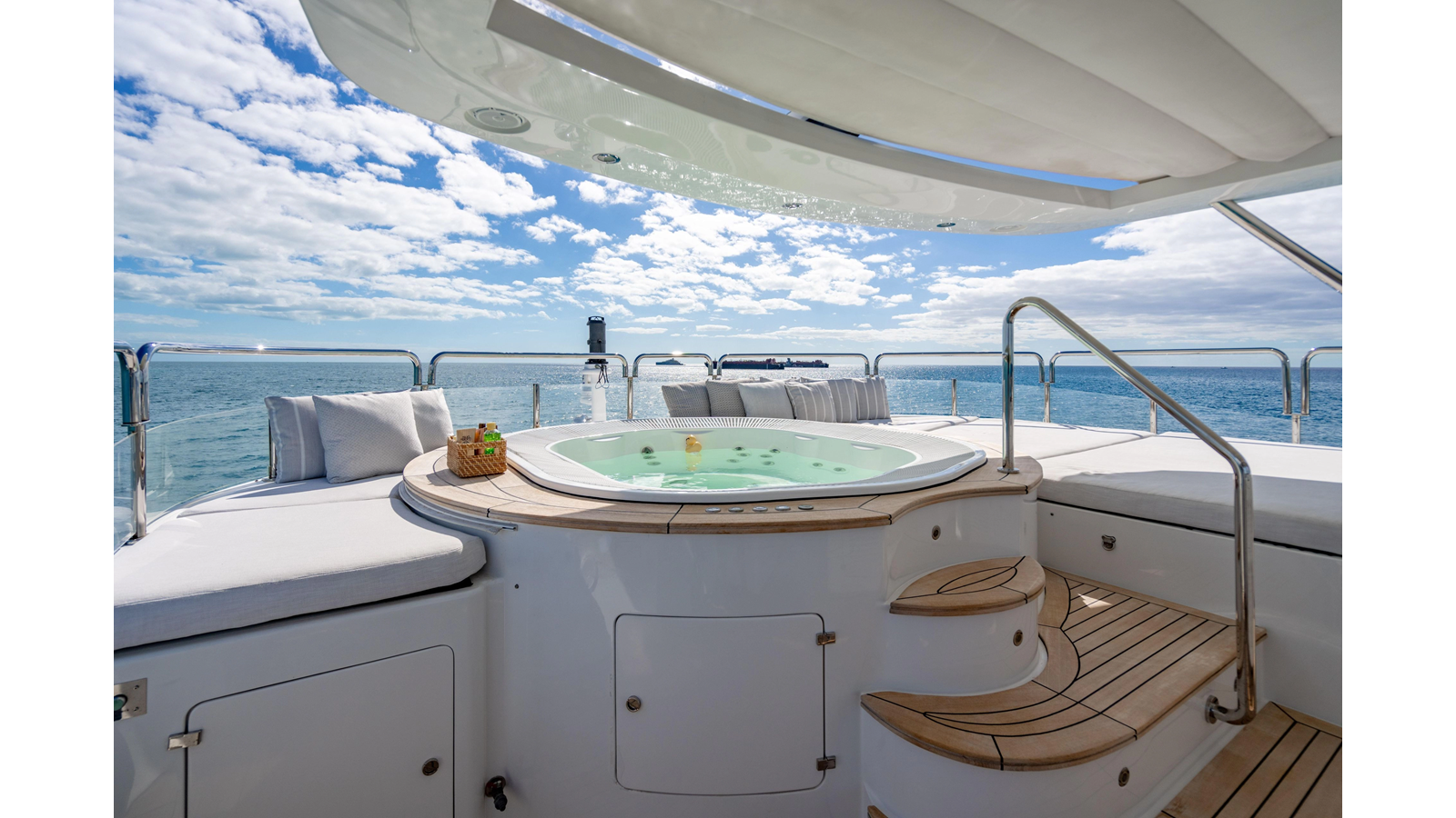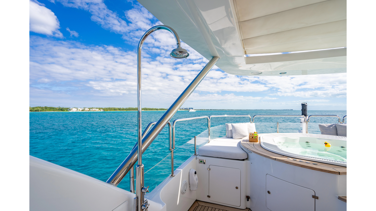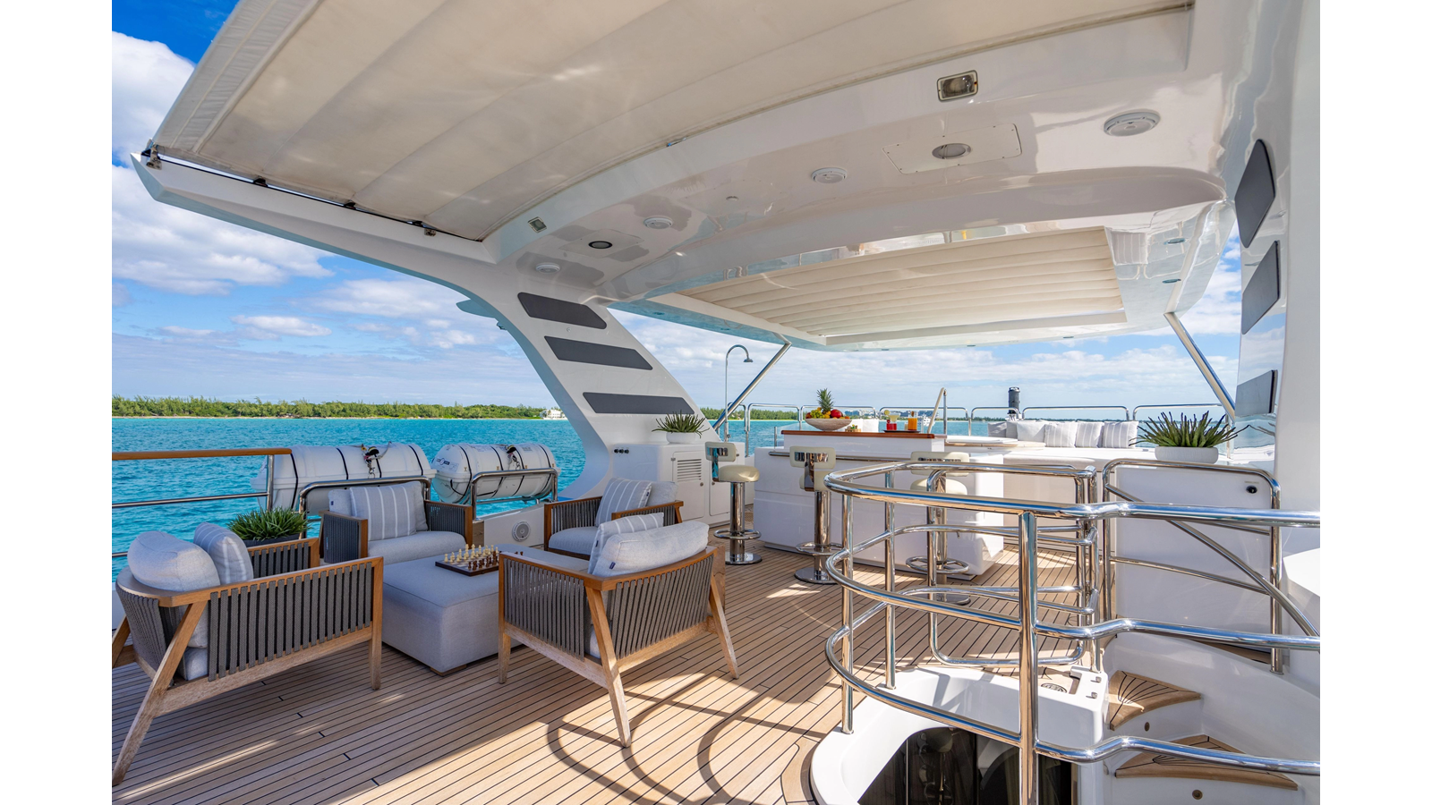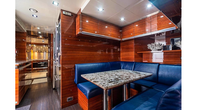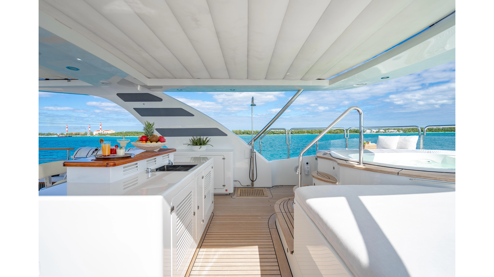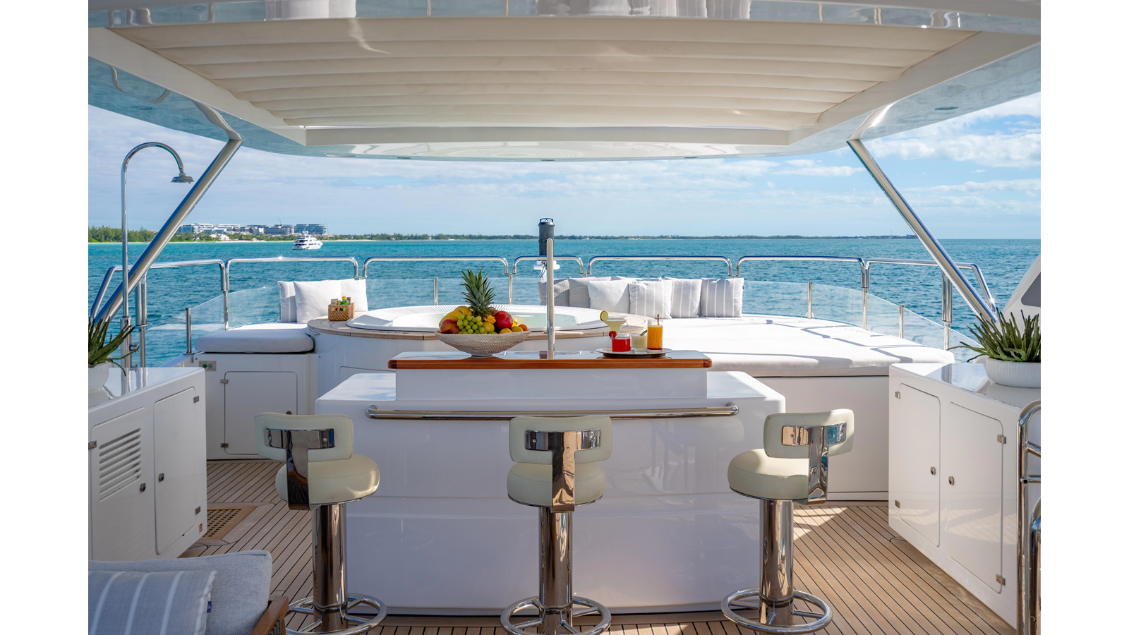Factory upgrades include a custom dinette in the galley (which could be redesigned for additional space if desired) and a custom hardtop with a removable shade in the aft section, allowing for both shade or sun, along with an opening roof over the bar and Jacuzzi.