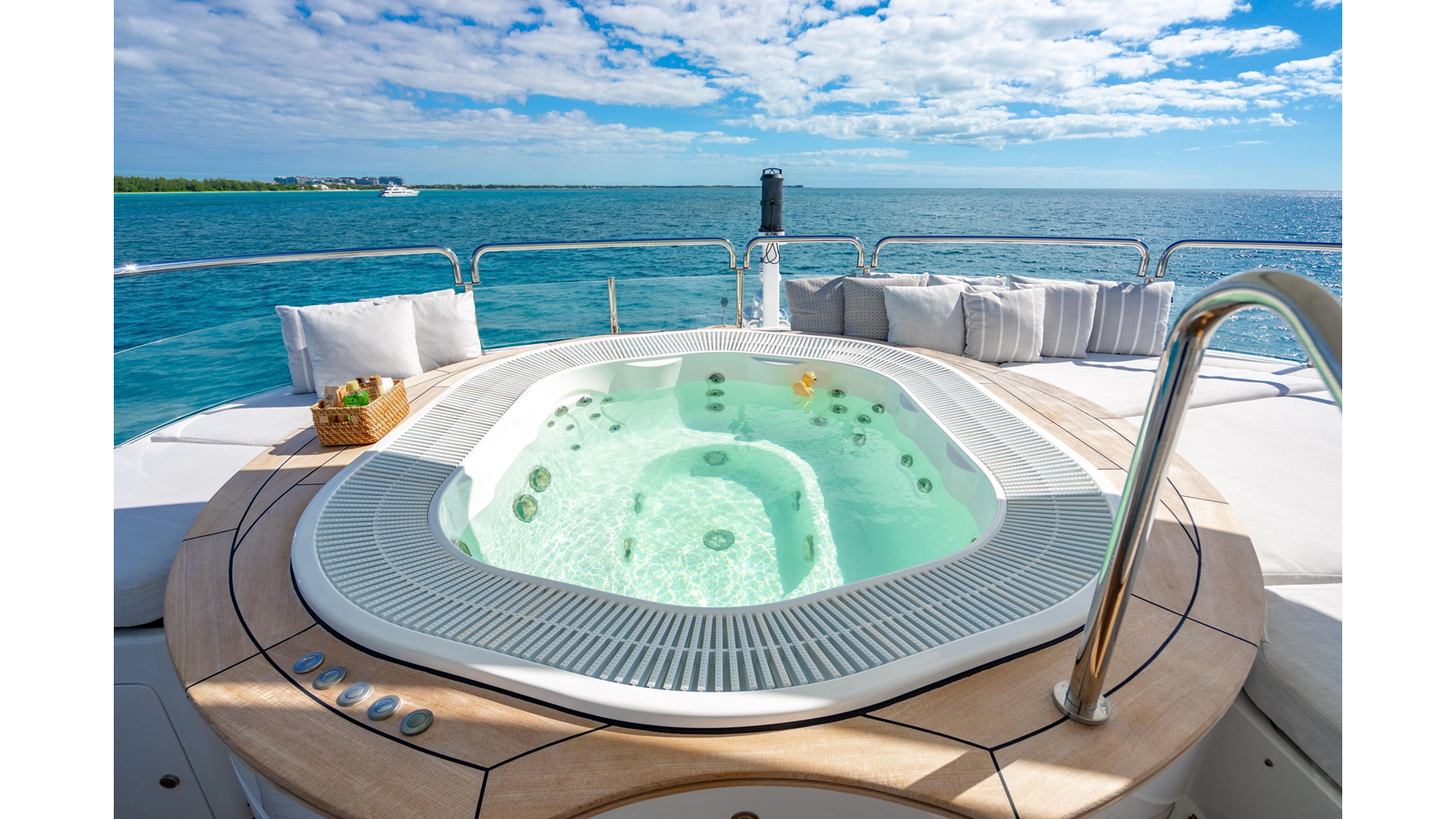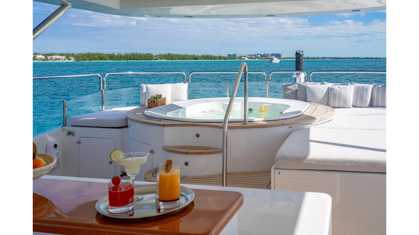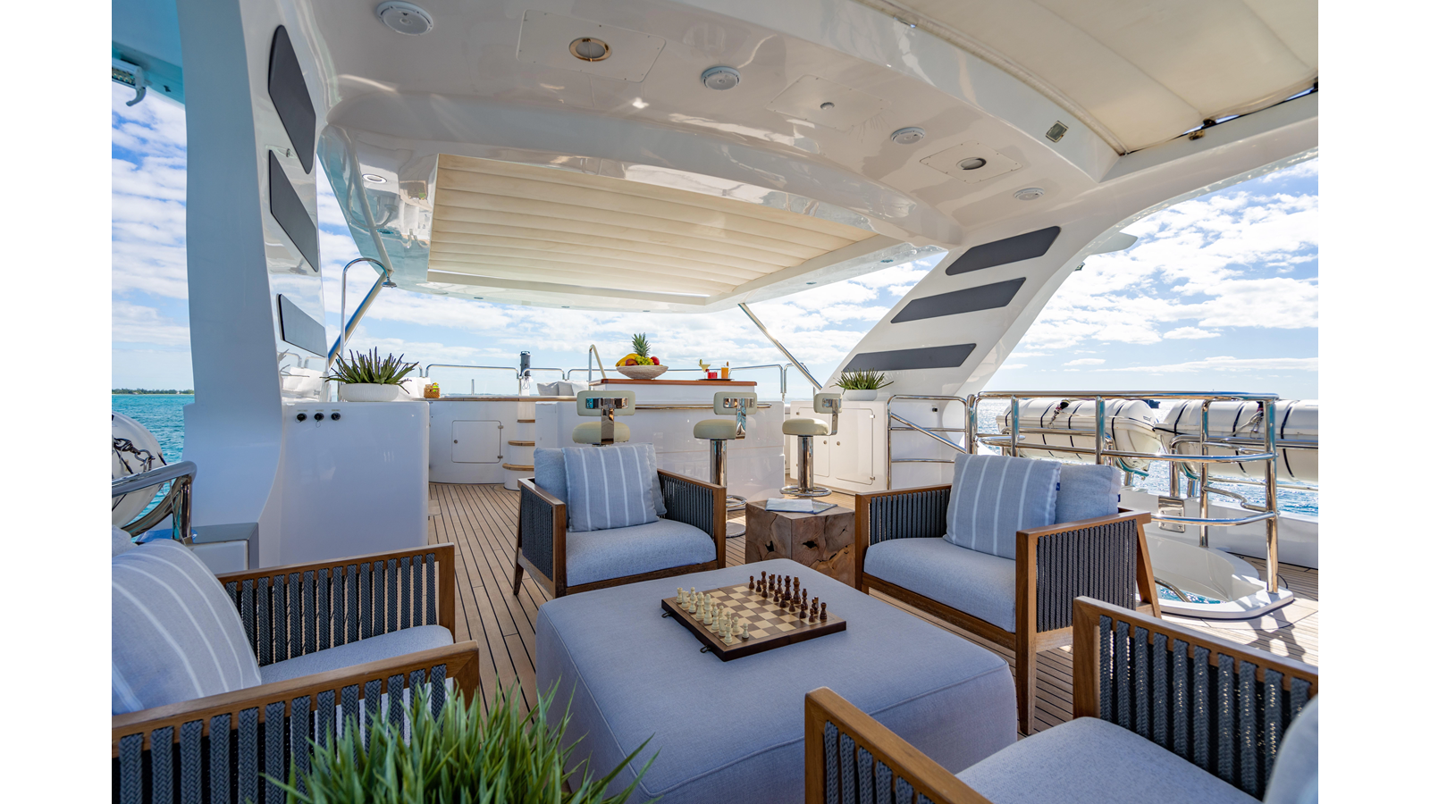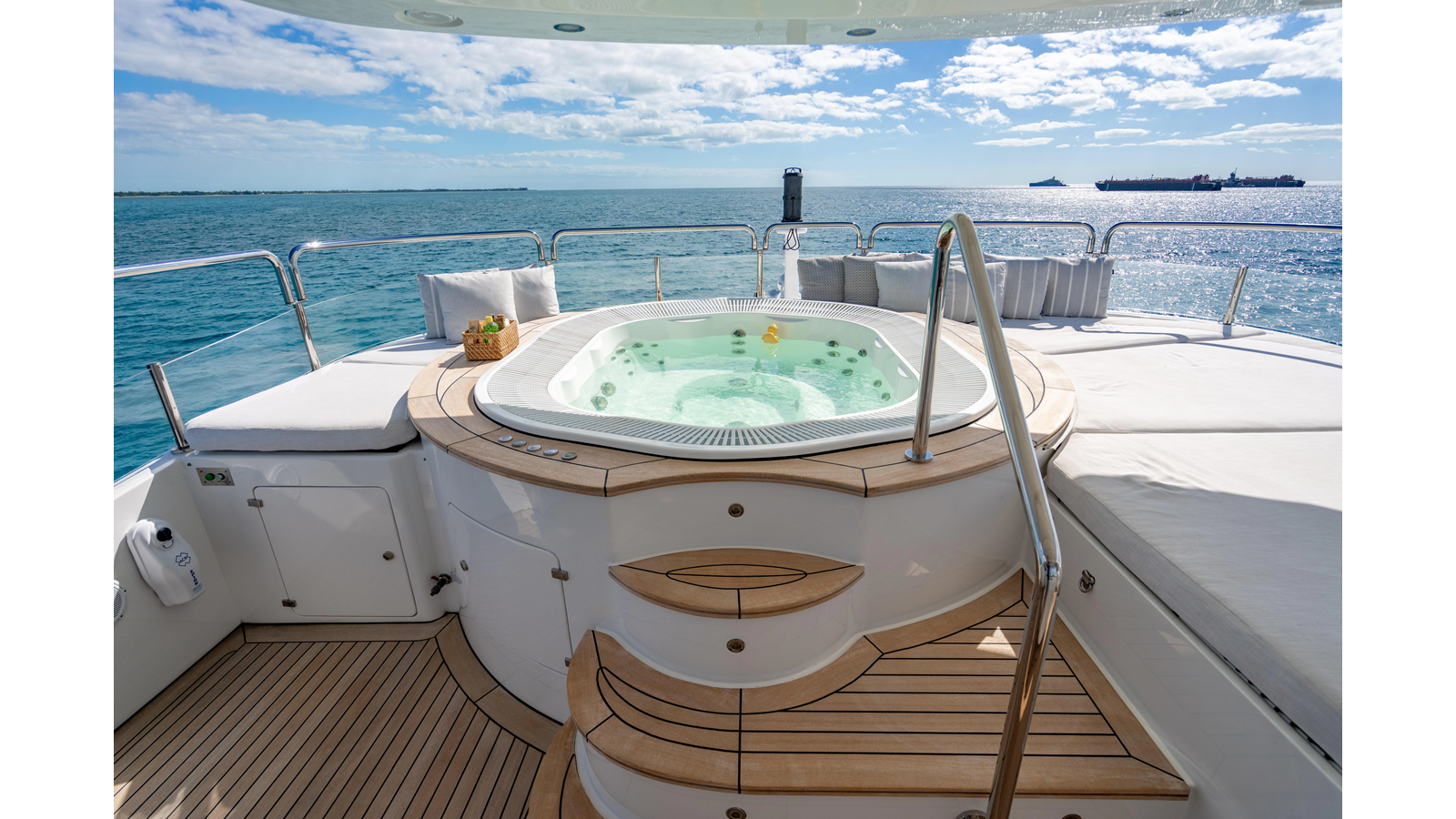 Factory upgrades include a custom dinette in the galley (which could be redesigned for additional space if desired) and a custom hardtop with a removable shade in the aft section, allowing for both shade or sun, along with an opening roof over the bar and Jacuzzi.