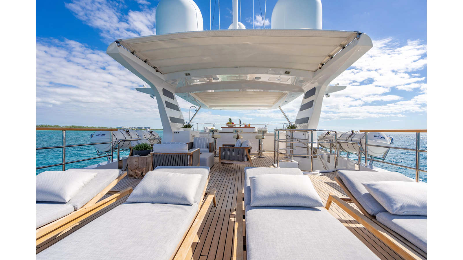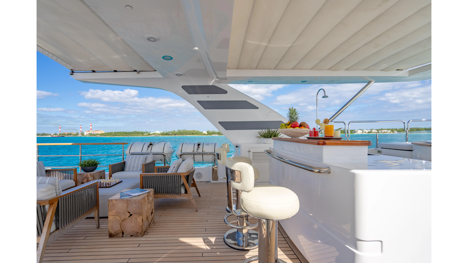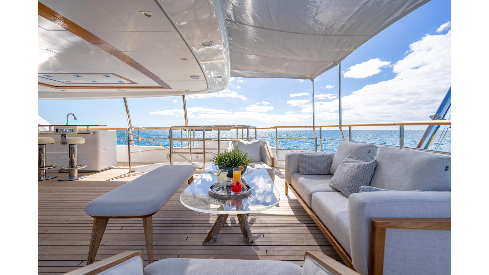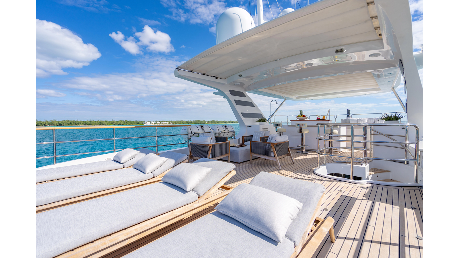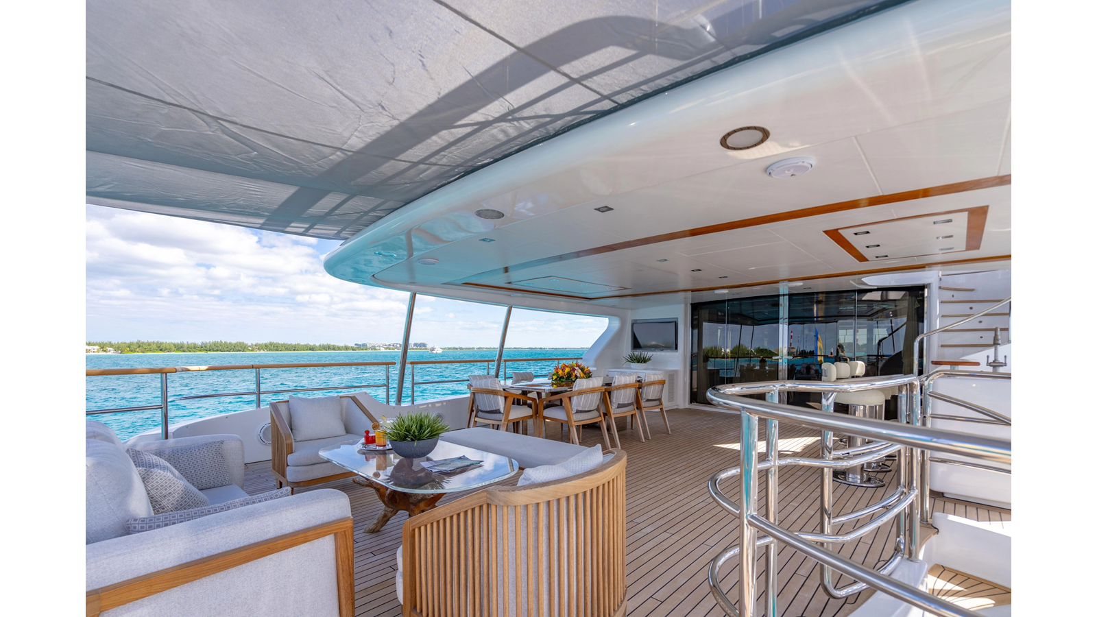 Factory upgrades include a custom dinette in the galley (which could be redesigned for additional space if desired) and a custom hardtop with a removable shade in the aft section, allowing for both shade or sun, along with an opening roof over the bar and Jacuzzi.