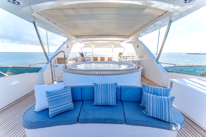 NAMASTE 121’ (36.89m) Benetti BC – 130 Motoryacht, 2013 boasts a unique layout with a custom American cherry interior, classically styled and accented with gold. The extended sundeck, complete with a retractable sunroof, offers ample space for relaxation and entertainment. Accommodating up to 10 guests with a main deck master and four warmly furnished staterooms on the lower deck. Each stateroom is elegantly adorned with Italian marble.