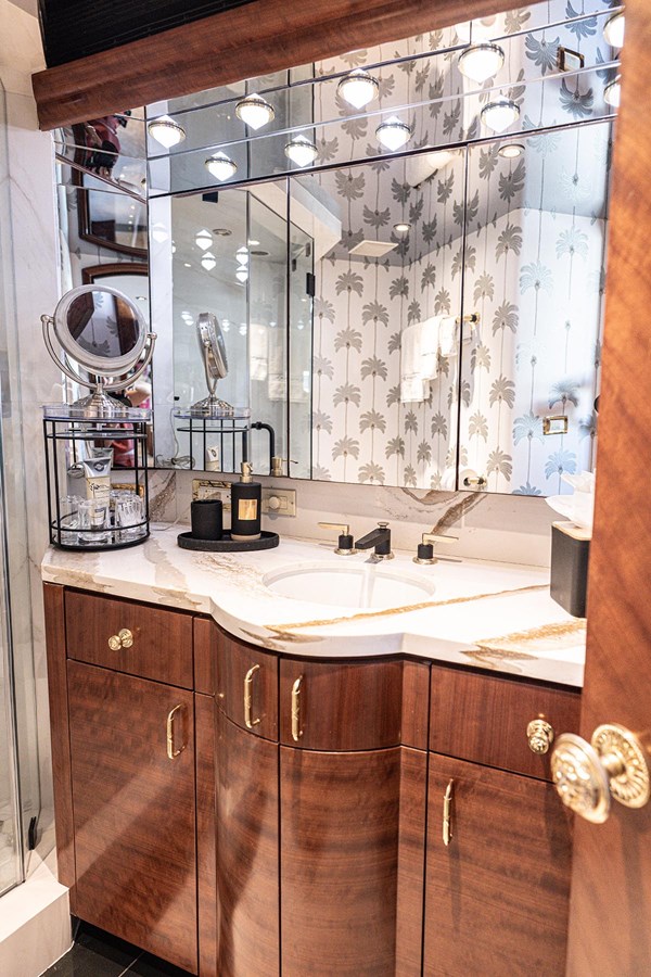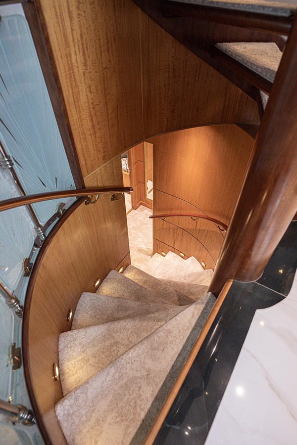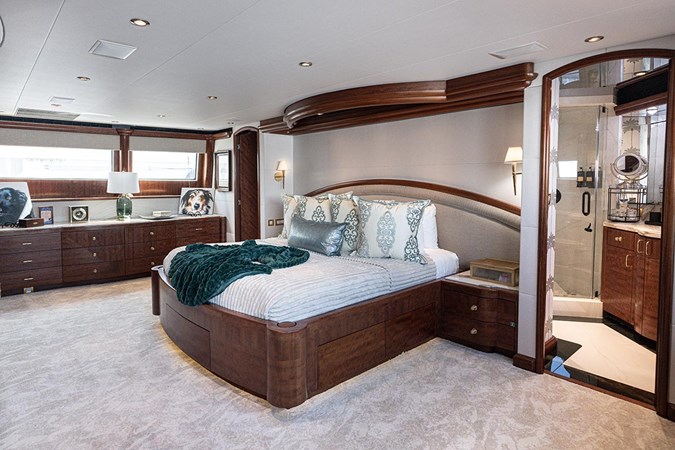 CHARLOTTE ANN, crafted by Cheoy Lee and designed by Frank Mulder, combines volume, style, and advanced systems. This ABS Class yacht features five staterooms with ensuite bathrooms, including a spacious master suite with dual baths and an office.