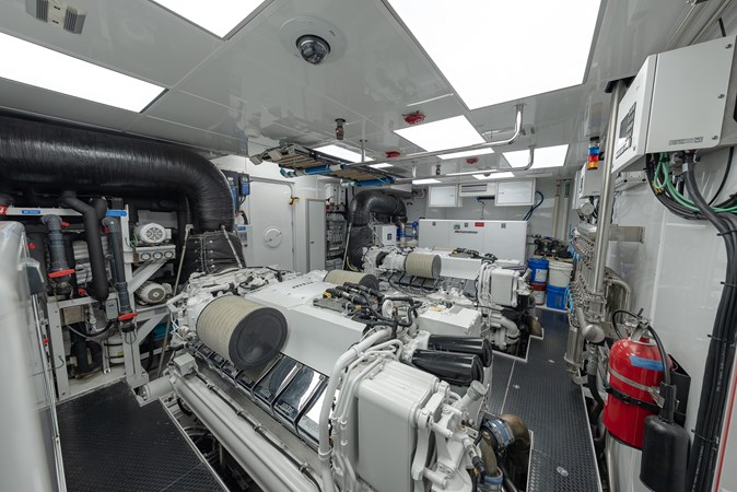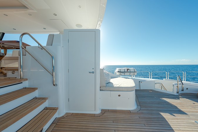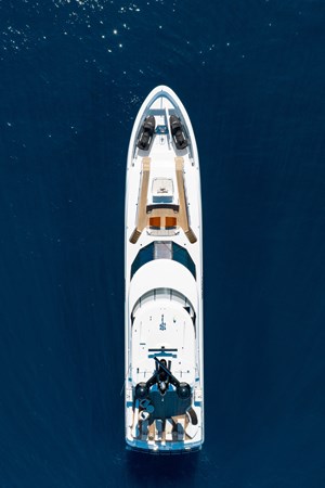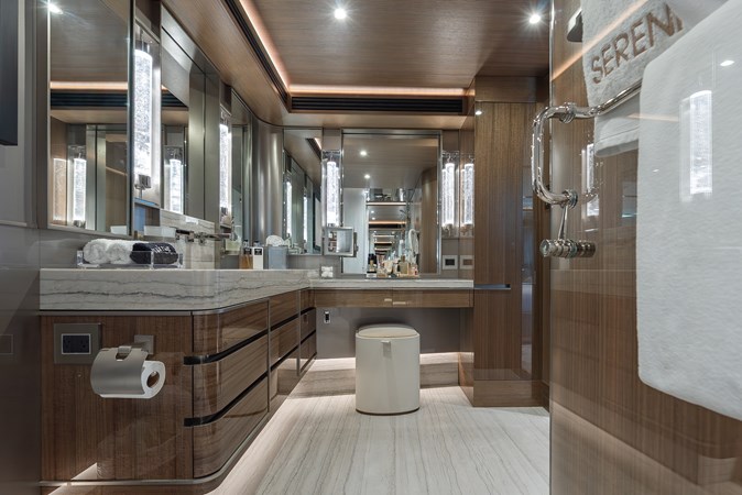 SERENITY features a contemporary interior designed by Holly Hunt. The design approach emphasizes a clear vision where casual elegance seamlessly combines with luxurious comfort, creating a cohesive theme throughout the space and materials. With windows extending to the ceilings, the design maintains a continuous flow from bow to stern, centering around the dining area as the heart of the yacht. This uninterrupted flow is key to the overall success of the project.