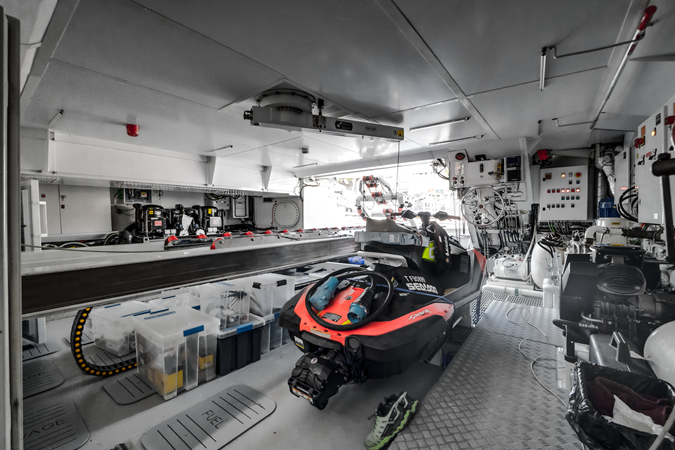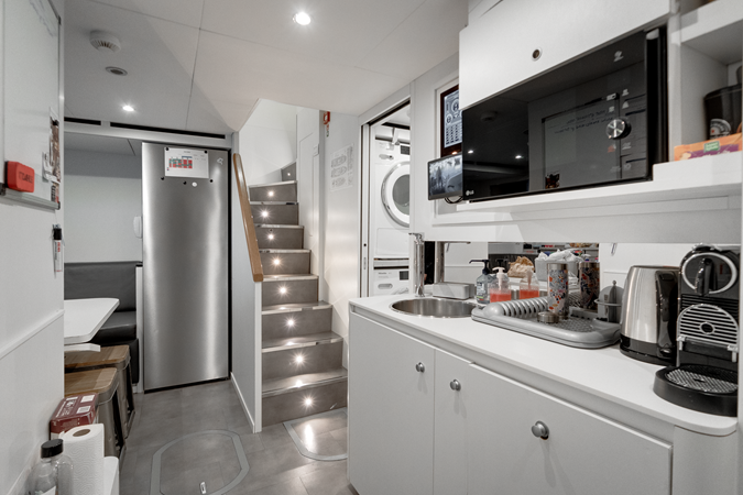 Inside, L.A.U.L exudes contemporary elegance with a soft palette of white, grey, and natural textures. The main saloon offers panoramic views and a seamless transition to a formal dining space for up to twelve guests. Five beautifully appointed staterooms accommodate twelve guests in supreme comfort, including a full-beam master suite on the main deck featuring a private study, walk-in wardrobe, and luxurious marble ensuite.