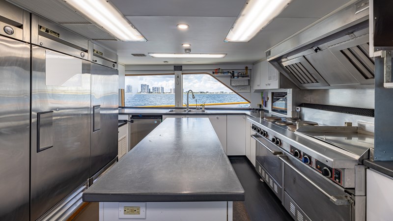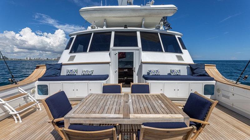 LADY SANDALS features a steel hull and aluminum superstructure with twin Caterpillar 3512 DITA engines. She can accommodate eight guests in four staterooms and carries up to 7 crew to ensure a relaxed and enjoyable experience onboard.
