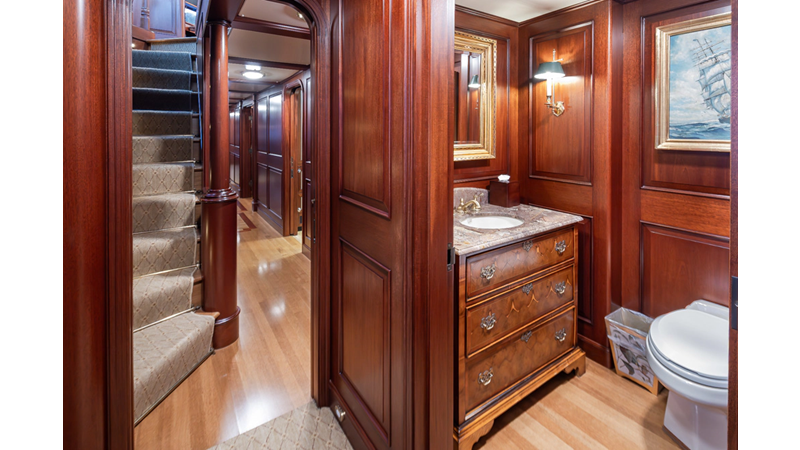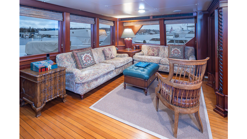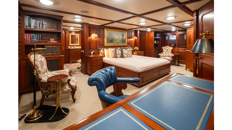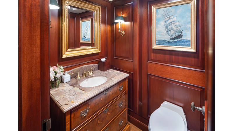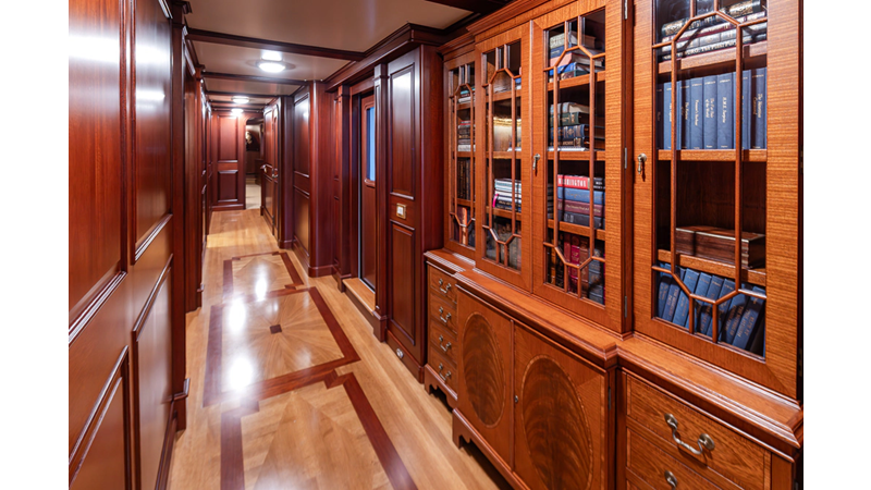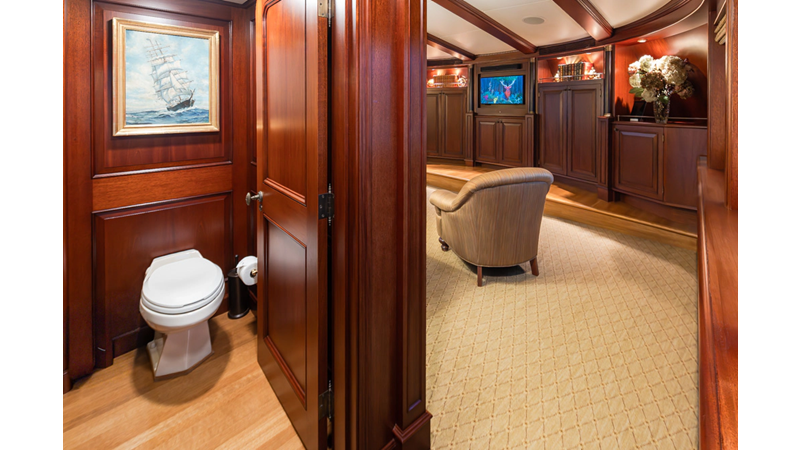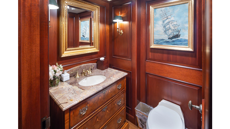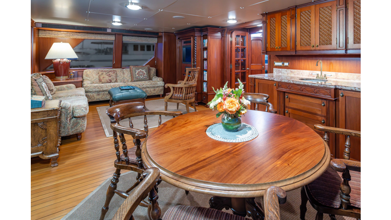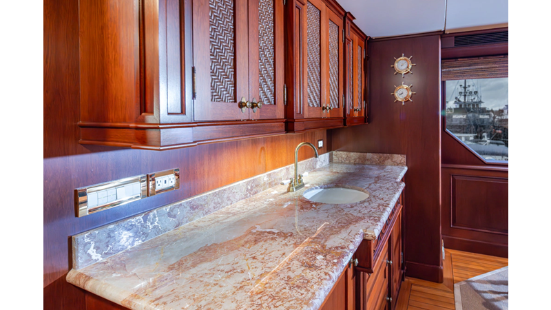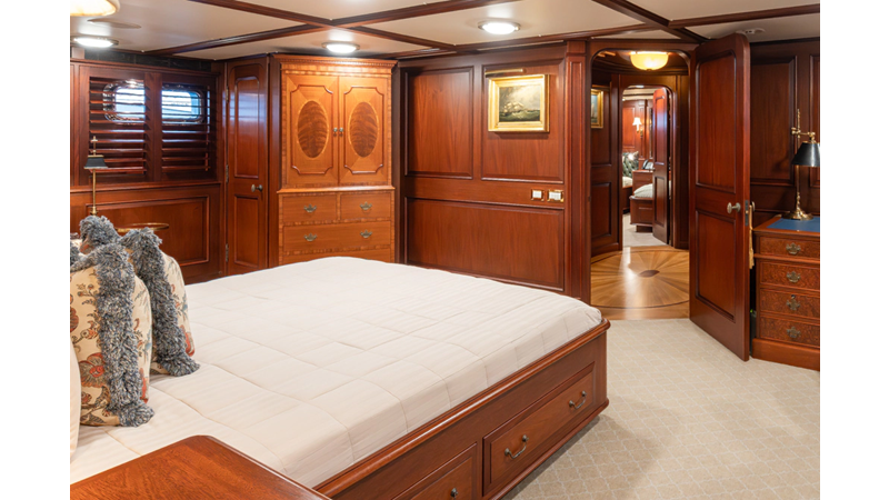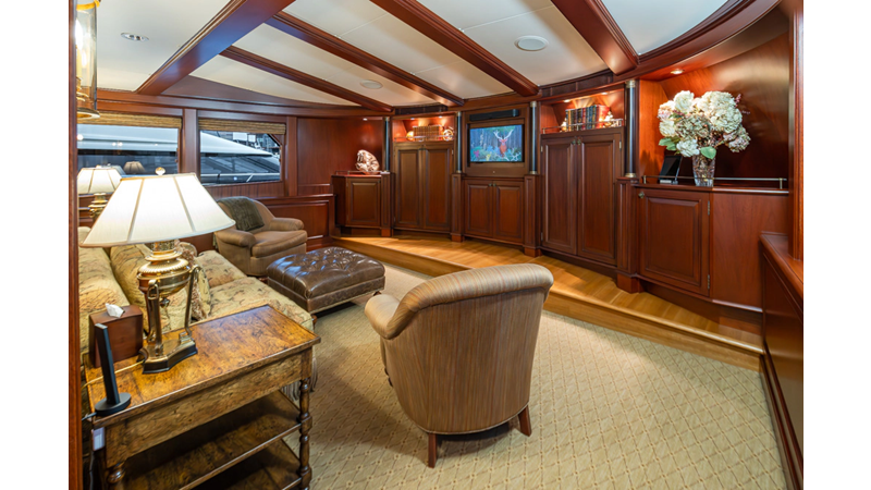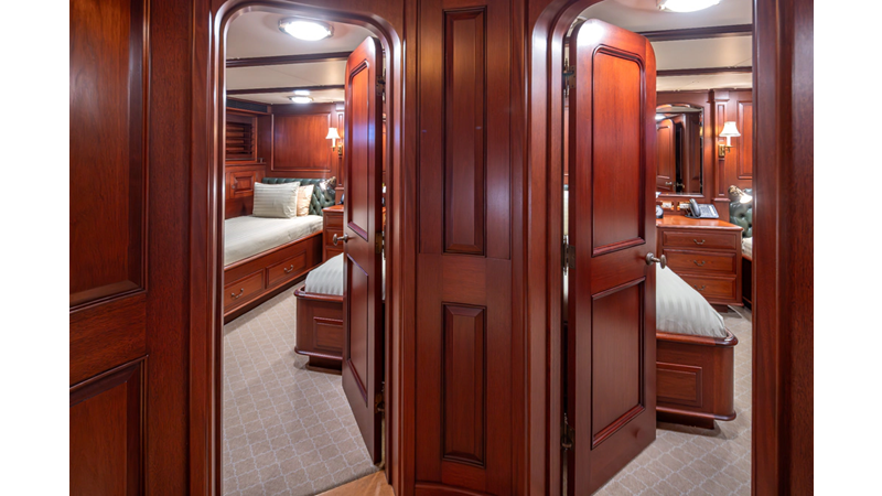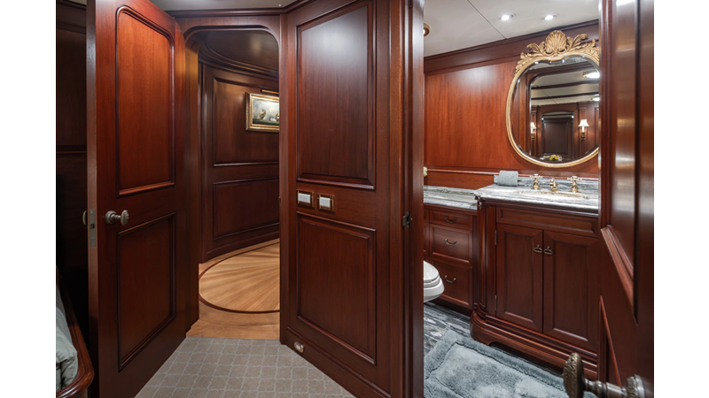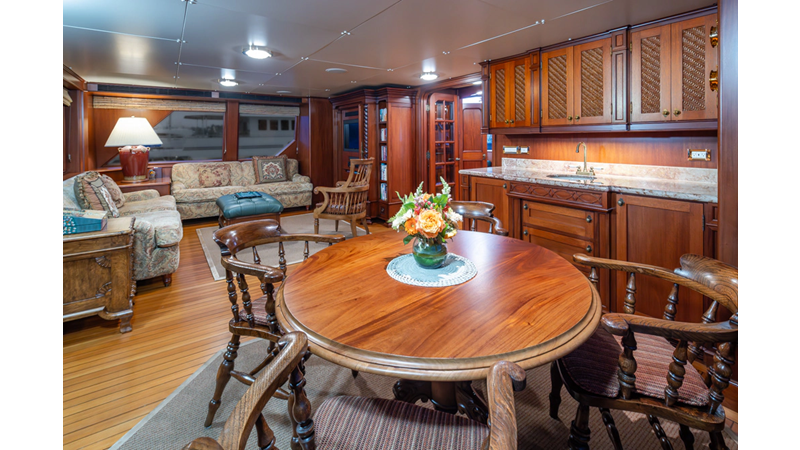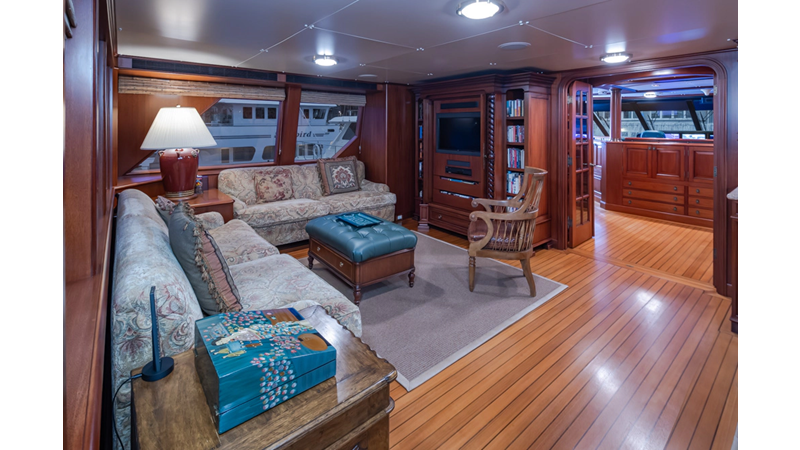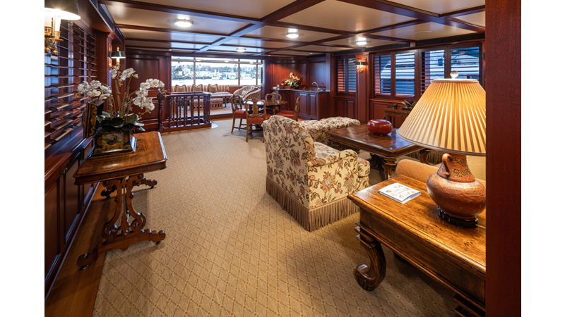 Uncommon in today’s marketplace, MARLINDA was designed for relaxed, private cruising rather than large charter-style gatherings. Her beautifully crafted mahogany interior showcases timeless American worksmanship throughout. Guests are welcomed aboard via the main deck aft into a gracious salon featuring a bar to port – ideal for entertaining. Forward lies the formal dining area with convenient access to a spacious, professionally designed galley on the port side. To starboard forward is a day head and an extensive library, offering flexibility to be converted into an on-deck owner’s suite if desired. Below deck, accommodations for six guests in two generous staterooms, along with a full-beam master suite.