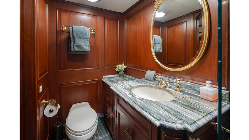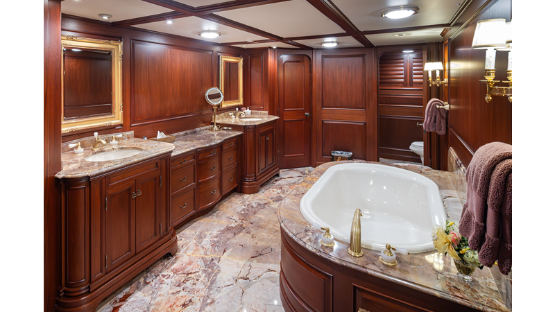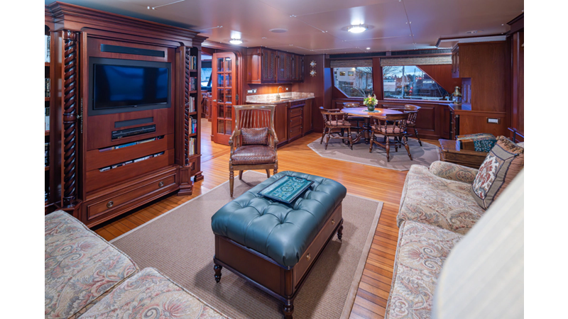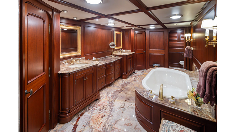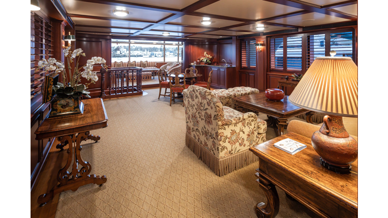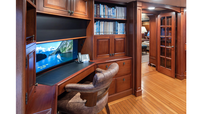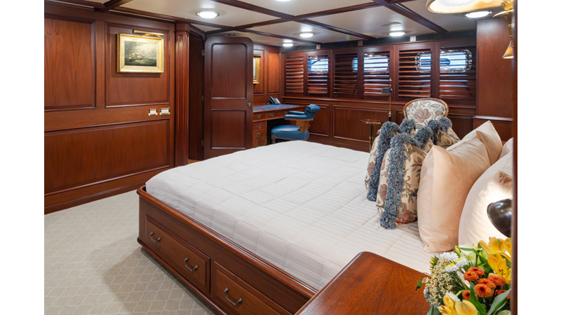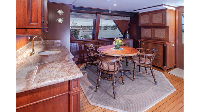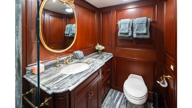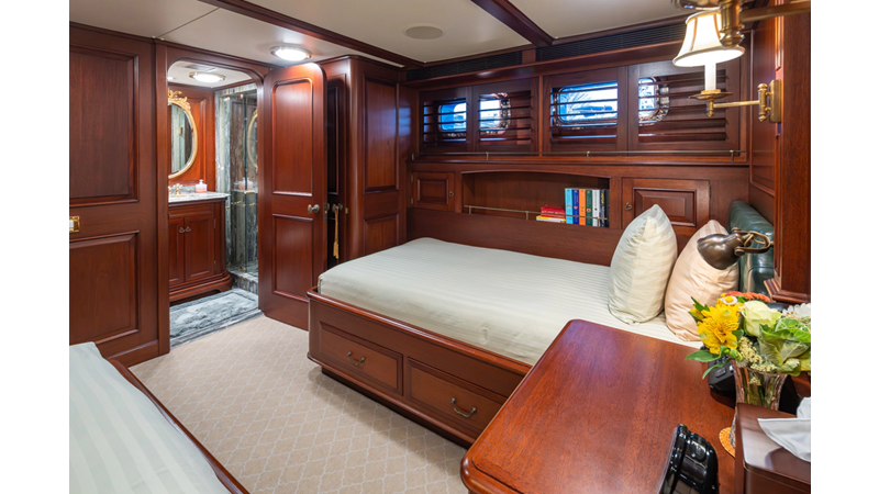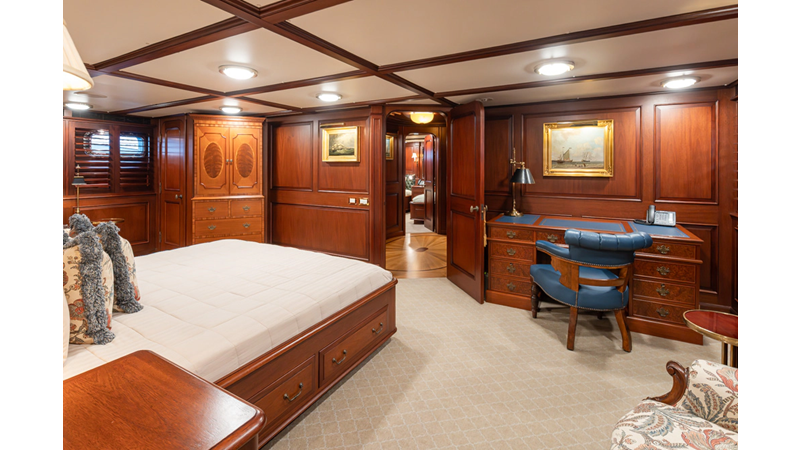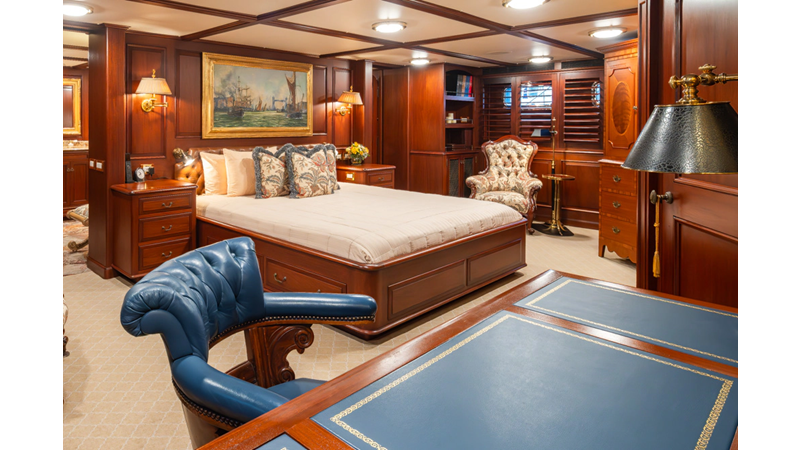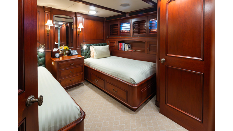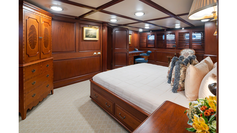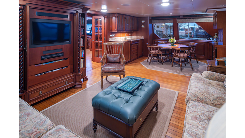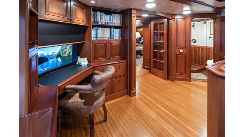 Uncommon in today’s marketplace, MARLINDA was designed for relaxed, private cruising rather than large charter-style gatherings. Her beautifully crafted mahogany interior showcases timeless American worksmanship throughout. Guests are welcomed aboard via the main deck aft into a gracious salon featuring a bar to port – ideal for entertaining. Forward lies the formal dining area with convenient access to a spacious, professionally designed galley on the port side. To starboard forward is a day head and an extensive library, offering flexibility to be converted into an on-deck owner’s suite if desired. Below deck, accommodations for six guests in two generous staterooms, along with a full-beam master suite.