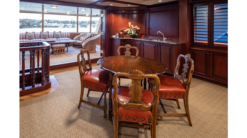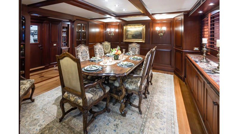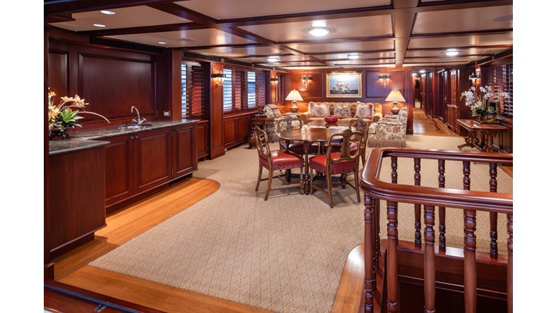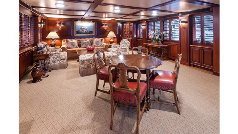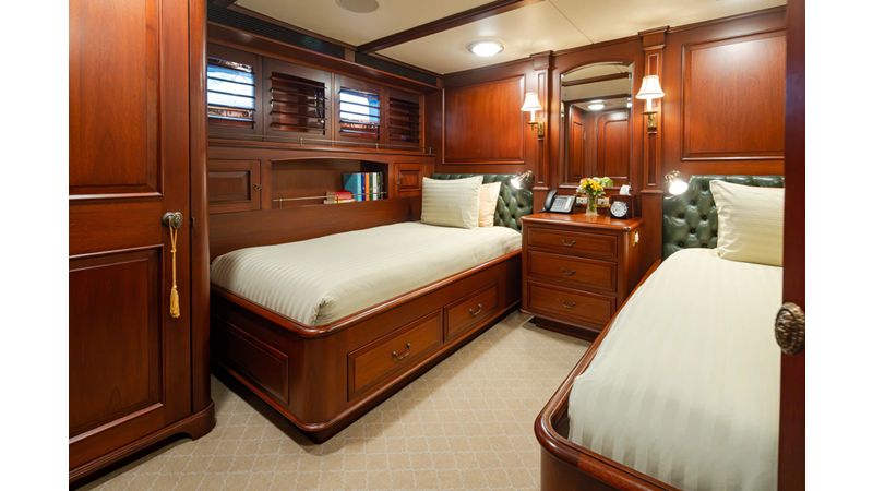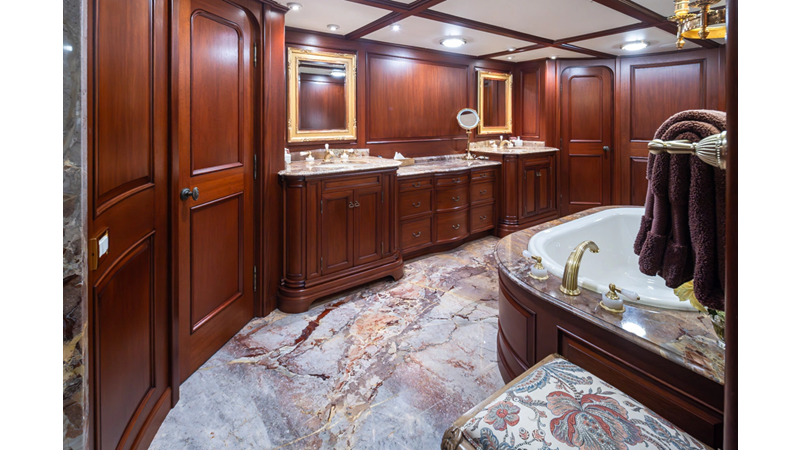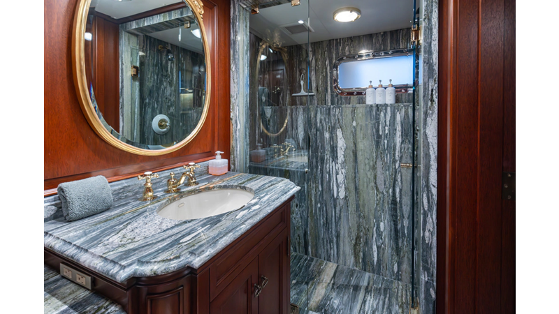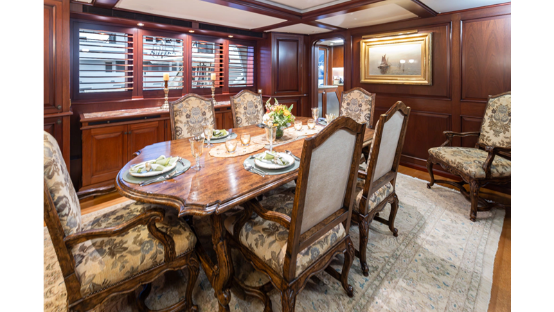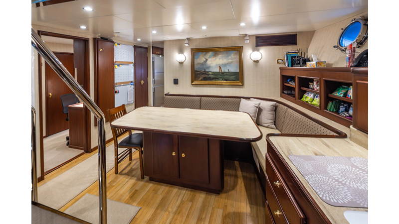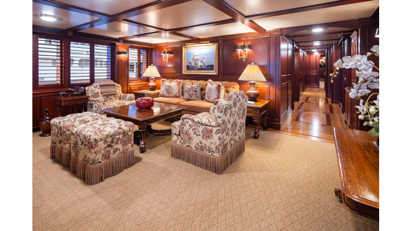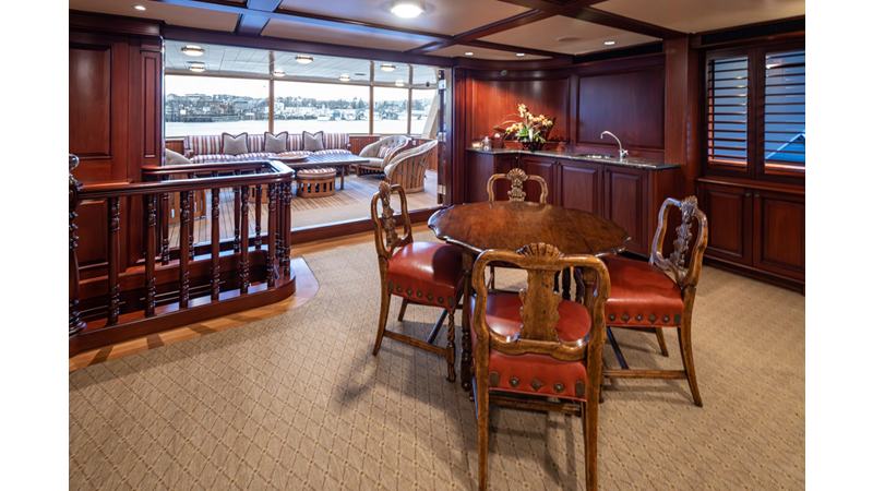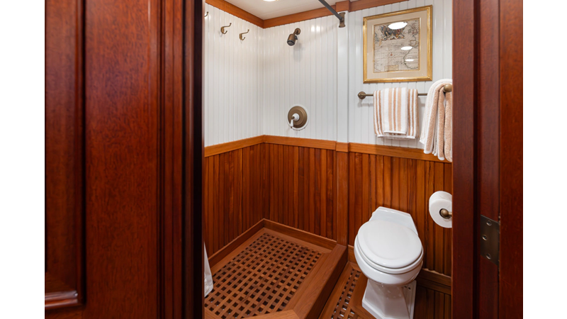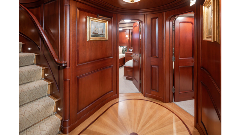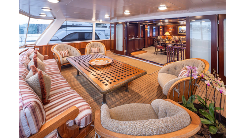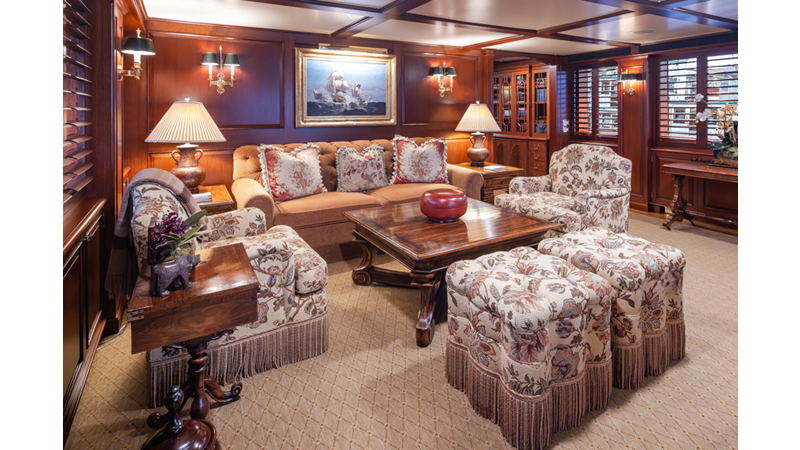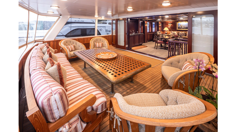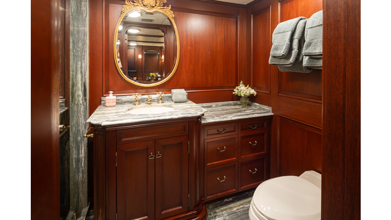 Uncommon in today’s marketplace, MARLINDA was designed for relaxed, private cruising rather than large charter-style gatherings. Her beautifully crafted mahogany interior showcases timeless American worksmanship throughout. Guests are welcomed aboard via the main deck aft into a gracious salon featuring a bar to port – ideal for entertaining. Forward lies the formal dining area with convenient access to a spacious, professionally designed galley on the port side. To starboard forward is a day head and an extensive library, offering flexibility to be converted into an on-deck owner’s suite if desired. Below deck, accommodations for six guests in two generous staterooms, along with a full-beam master suite.