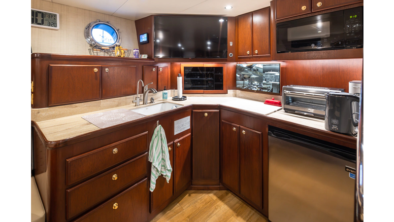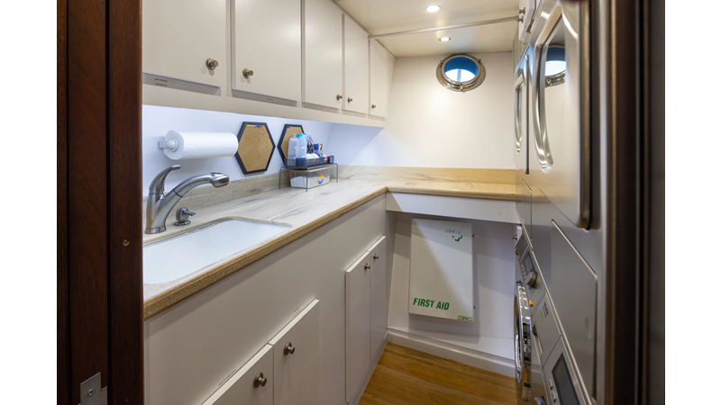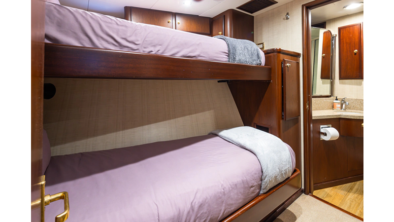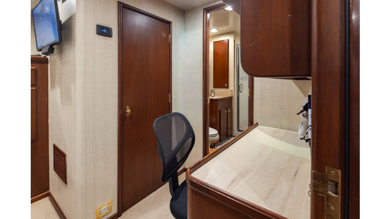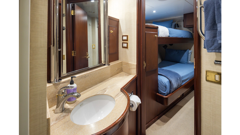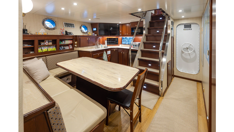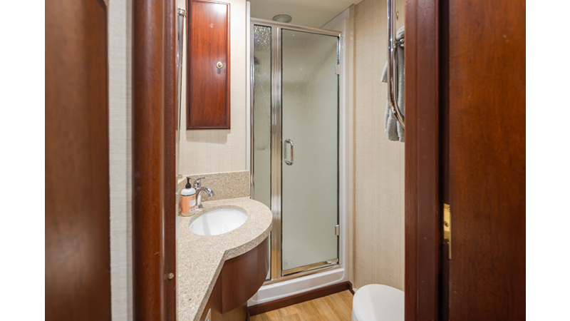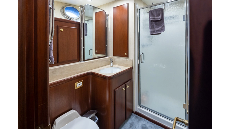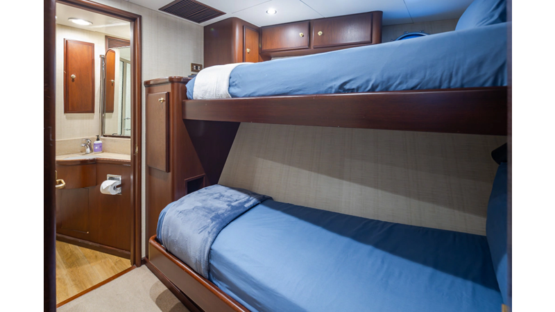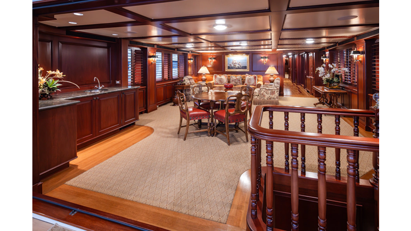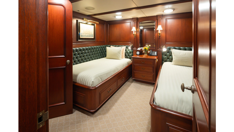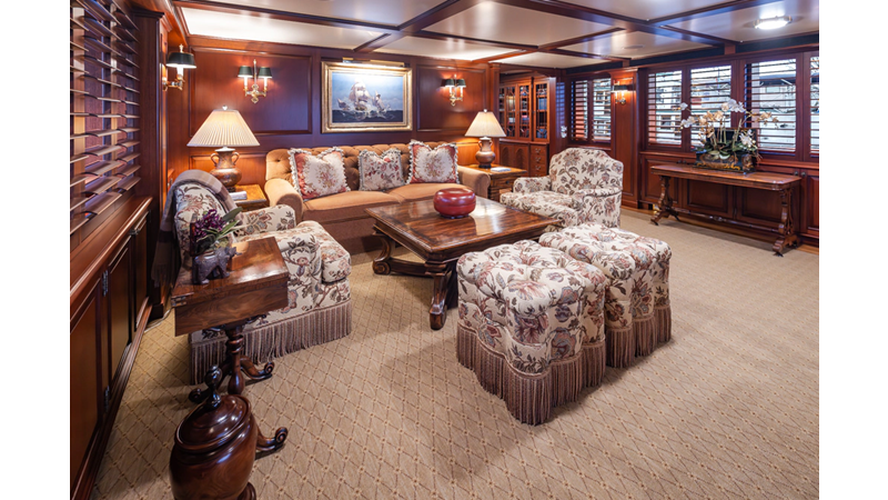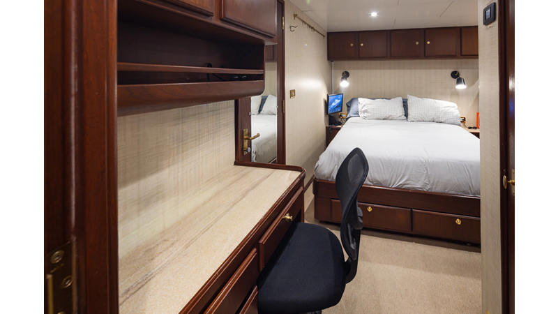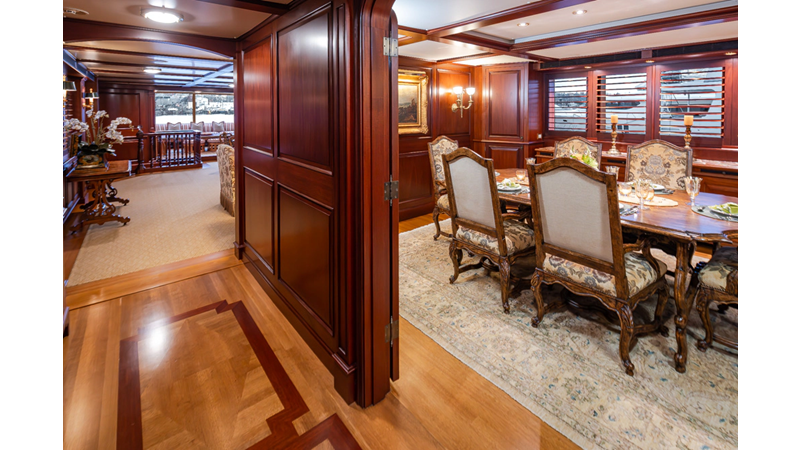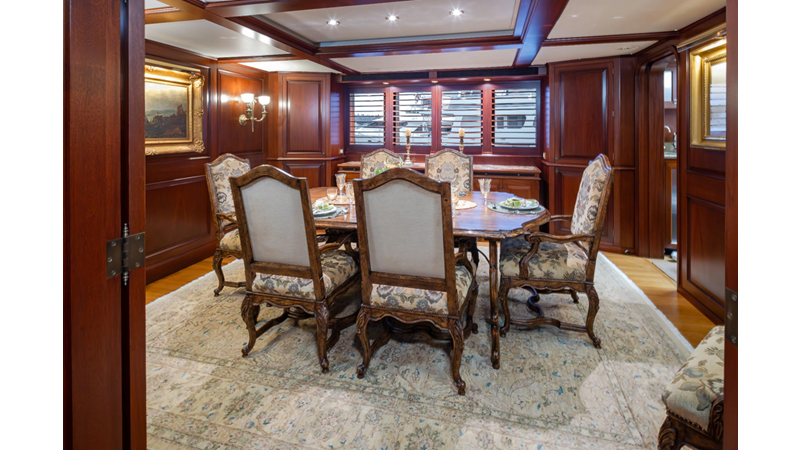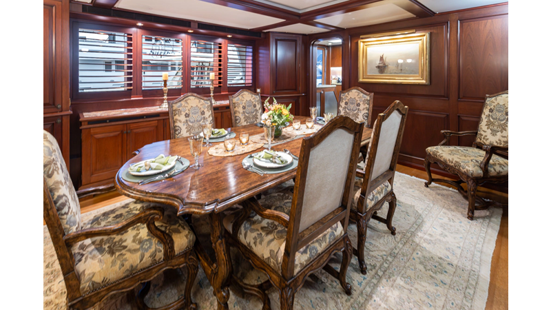Uncommon in today’s marketplace, MARLINDA was designed for relaxed, private cruising rather than large charter-style gatherings. Her beautifully crafted mahogany interior showcases timeless American worksmanship throughout. Guests are welcomed aboard via the main deck aft into a gracious salon featuring a bar to port – ideal for entertaining. Forward lies the formal dining area with convenient access to a spacious, professionally designed galley on the port side. To starboard forward is a day head and an extensive library, offering flexibility to be converted into an on-deck owner’s suite if desired. Below deck, accommodations for six guests in two generous staterooms, along with a full-beam master suite.