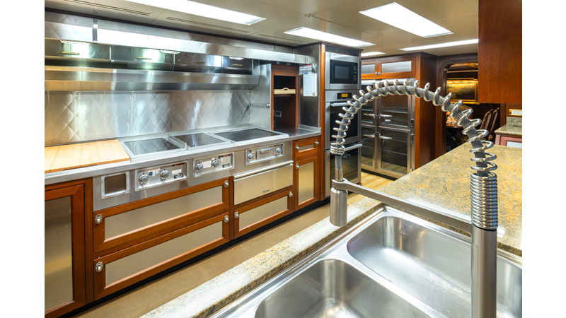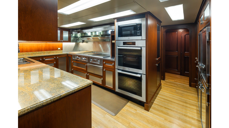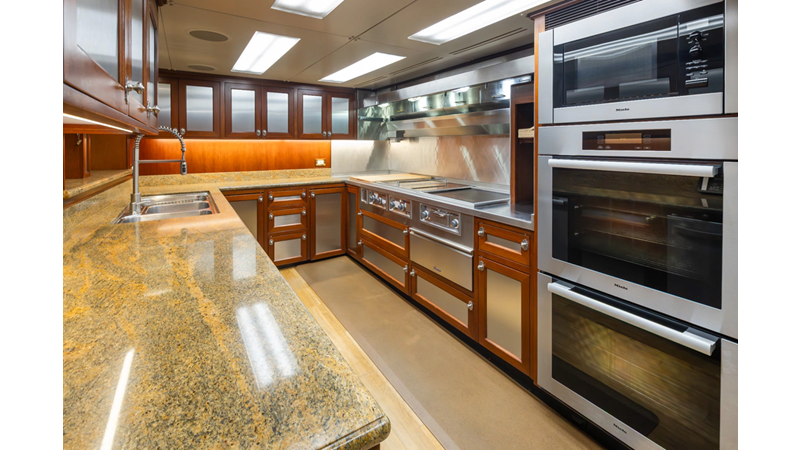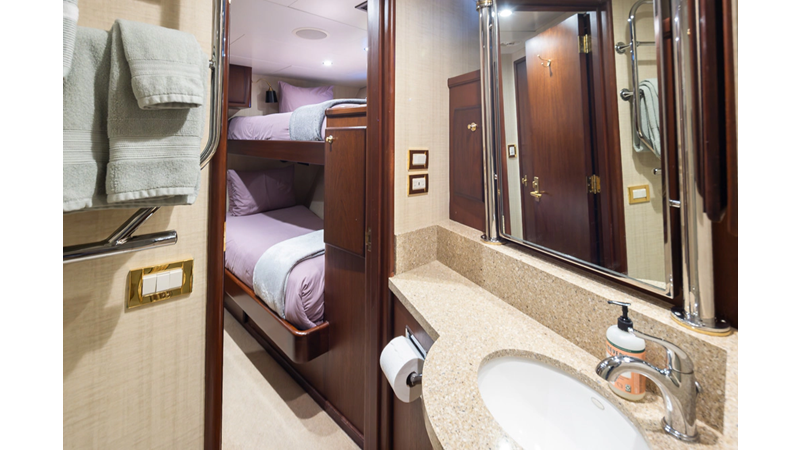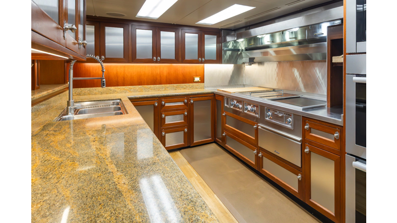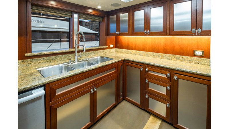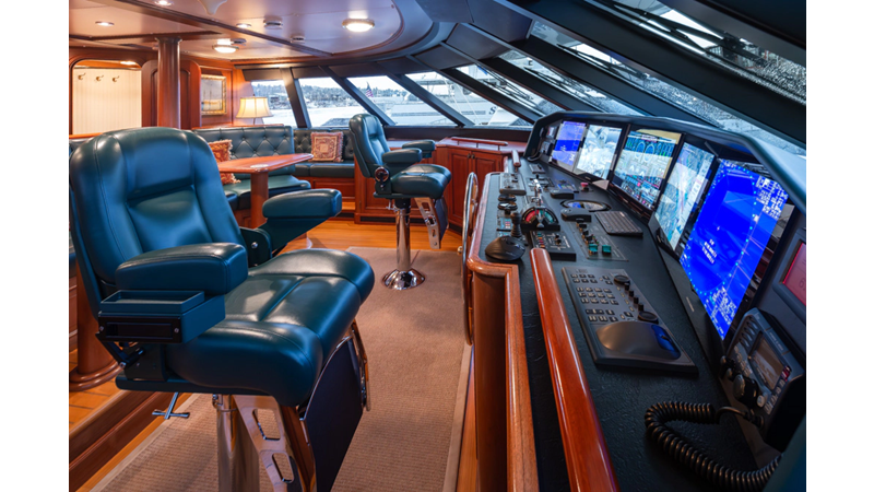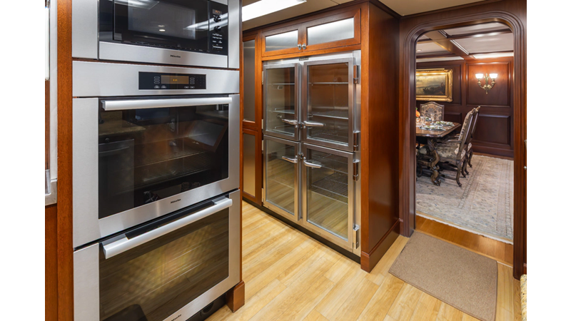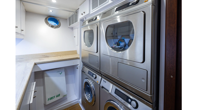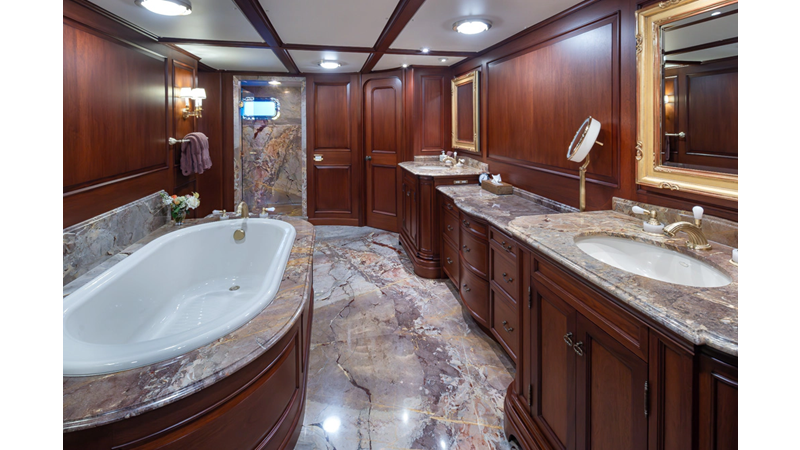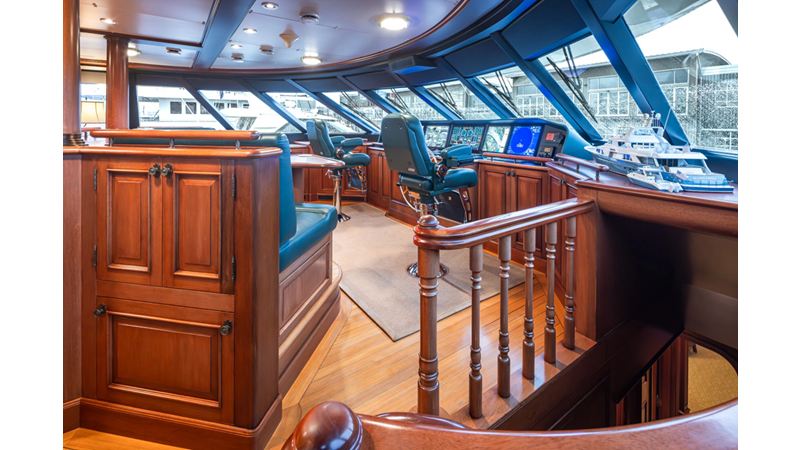 Powered by proven CAT engines and stabilized with Naiad fin stabilizers, MARLINDA offers an impressive cruising range of more than 4,000 nautical miles while delivering excellent comfort underway. The fully enclosed and climate-controlled California deck provides a welcoming space in all weather conditions, while the large aft cockpit supports fishing, cruising, and active time on the water. The wheelhouse is notably open and inviting, complete with excellent visibility, a dedicated day head, and an adjacent sky lounge – encouraging guests to share in the navigation experience. On the boat deck, dual port and starboard davits rated at 4,500 lbs each allow for effortless deployment of tenders up to 26 feet.