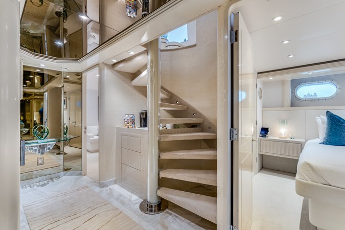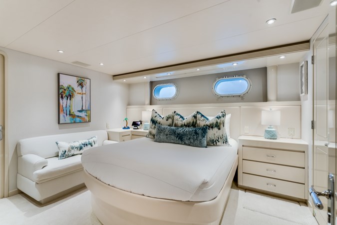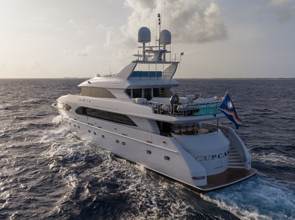 CUPCAKE is a modern U.S.-built yacht featuring a soothing crème and turquoise interior with mother-of-pearl accents. It offers a full-beam master suite on the main deck and four well-appointed guest staterooms below, all with ensuite bathrooms. The bright main salon and open dining area can accommodate ten guests, while a marble bar leads to an alfresco dining space. The spacious sundeck includes a Jacuzzi, dining area, and sun pads, making it perfect for cruising and charters.
