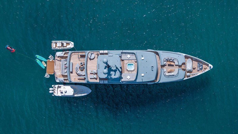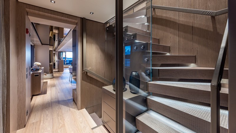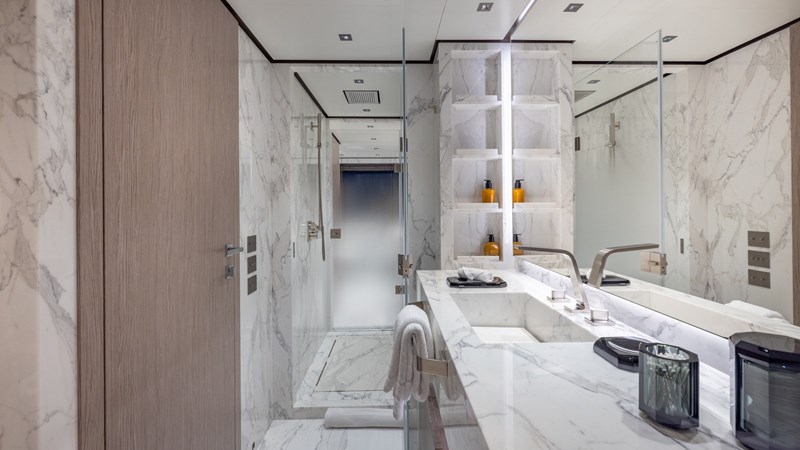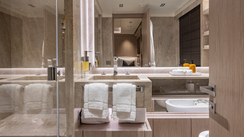 Accommodating up to 12 guests in five spacious cabins, GIOIA offers generous areas for relaxation and entertainment. The full-beam master suite is located on the main deck and includes a private lounge, his-and-hers walk-in wardrobes, and a his-and-hers bathroom. Four additional guest cabins are situated on the lower deck, including two double cabins and two twin cabins with Pullman bunks – all appointed with en suite bathrooms.