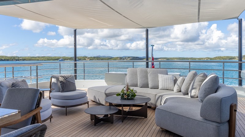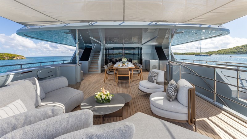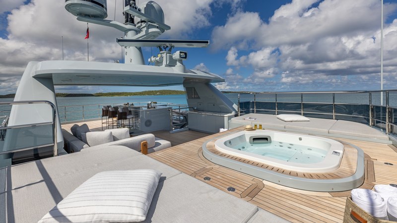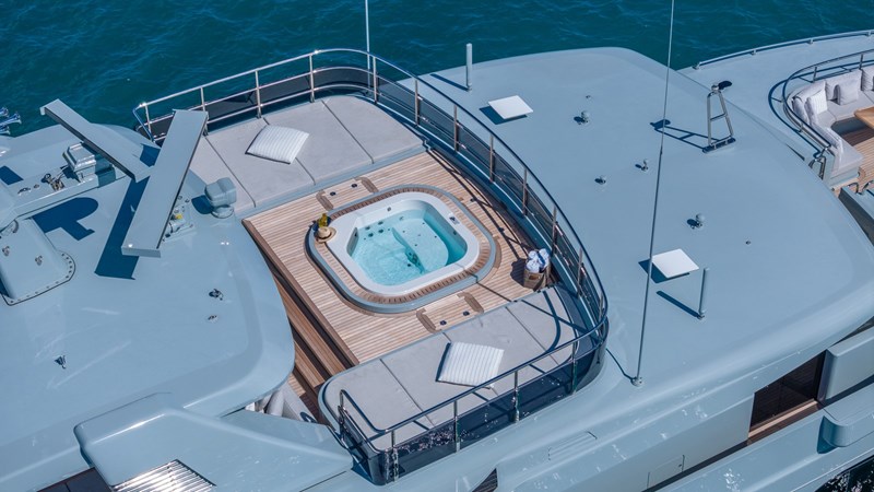 GIOIA’s exterior decks offer multiple lounging and entertainment options for life at sea. The expansive sun deck features a raised jacuzzi, generous sunpads, a full wet bar, and an aft seating area. The bridge-deck aft hosts a spacious al fresco dining area, while further lounging spaces can be found on the main-deck aft and foredeck, providing a variety of settings throughout the day.