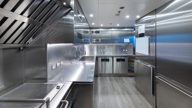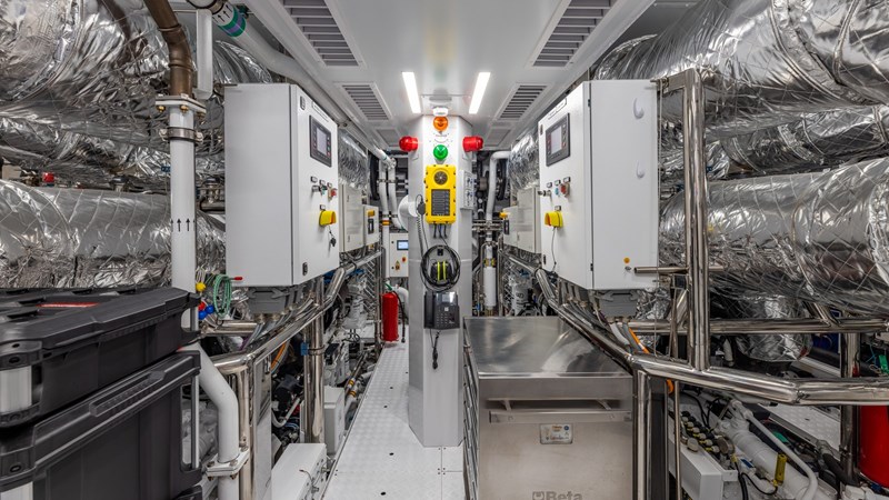 Twin Caterpillar C32 engines deliver a maximum speed of 16.5 knots and a cruising speed of 11 knots, with a transatlantic range of 4,000 nm.