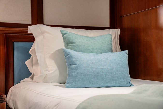 JUST ENOUGH accommodates up to 11 guests in five beautifully appointed cabins , including a stunning Master suite on the main deck . This expansive suite features a king-size bed and a lavish en-suite bathroom , adorned with Italian marble finishes and a luxurious corner spa tub —a private retreat in itself.