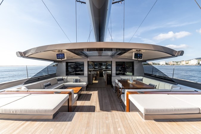 On the main deck, the lounge has comfortable U-shaped seating opposite a formal dining table to port. Blending inside and out, expansive glass doors aft open out to the recessed aft cockpit. Furnished with the best of everything, a warm colour palette perfectly pairs with modern furnishings.