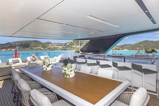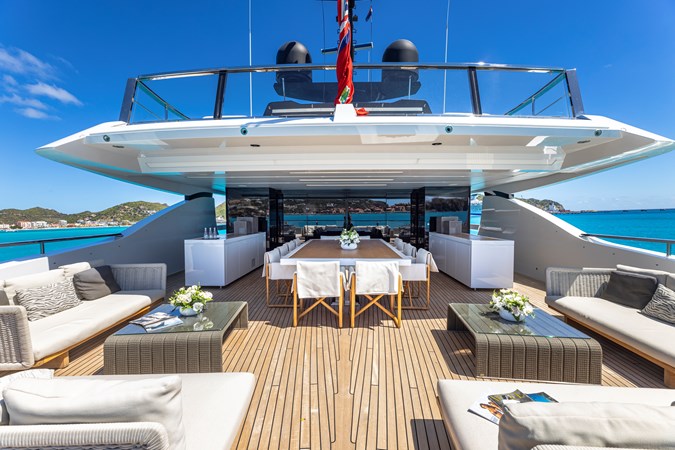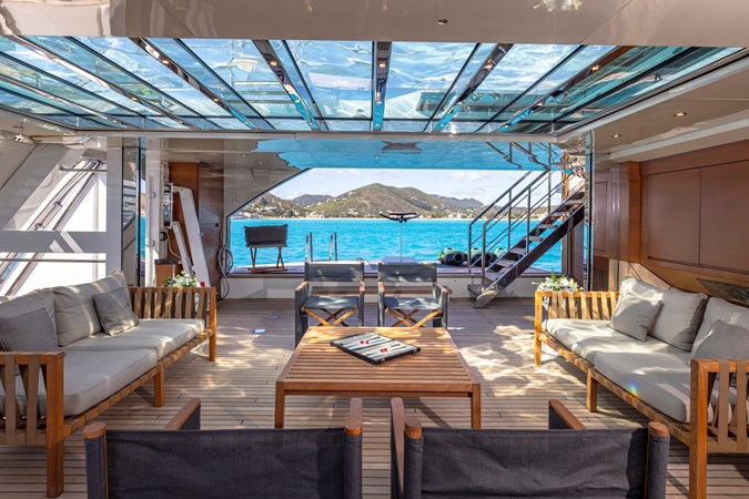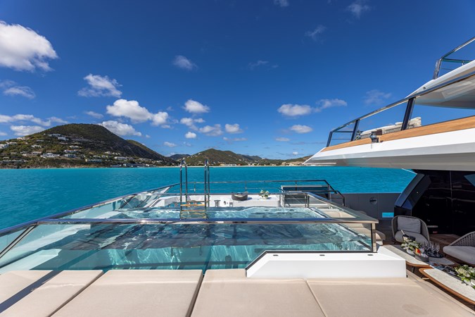 Her interiors, by Officina Italiana Design, are light-filled and contemporary, with a refined palette of white, taupe, beige, and warm brown leathers, accented by glass, marble, and reflective surfaces that amplify space and elegance. Outside, her sleek, modern lines are punctuated by signature features: a glass-bottom pool and a drive-in tender bay that transforms into a full-beam beach club with floating terraces, perfect for entertaining or relaxing in style.