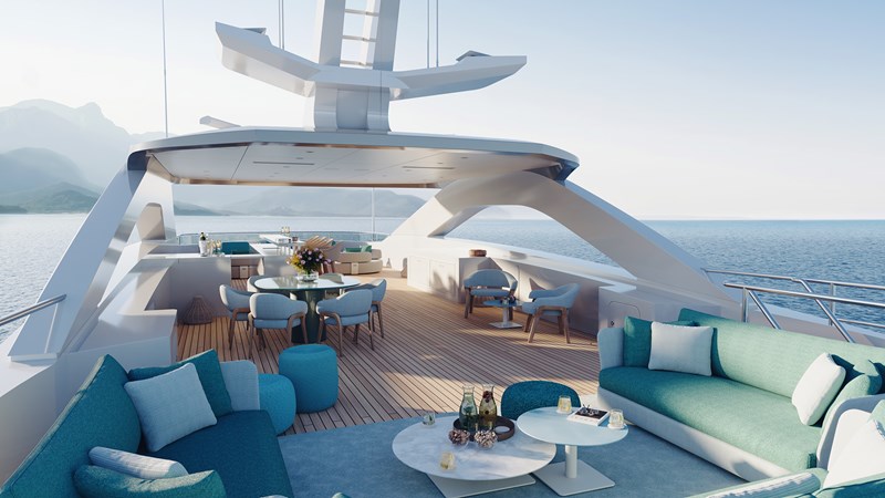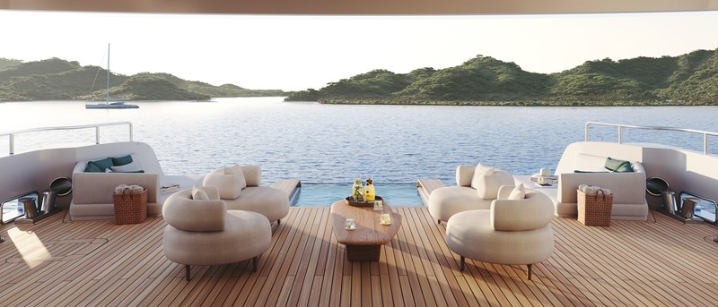Innovations include a redesigned mast, a contemporary feature that owners can personalise with custom accent colours, and an infinity pool integrated into the main deck aft. Reduced mullions in the main saloon and skylounge increase the glass-to-metal ratio, dissolving the boundary between the yacht’s interior and the sea. The enlarged bridge deck VIP suite enhances the overall accommodation, providing a versatile retreat suited to private and charter use with multigenerational guests.