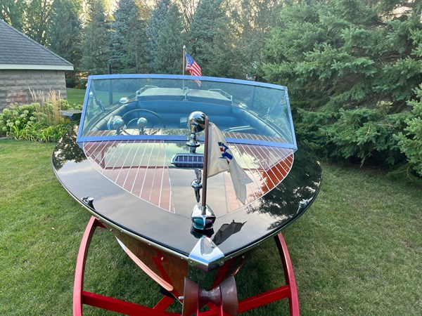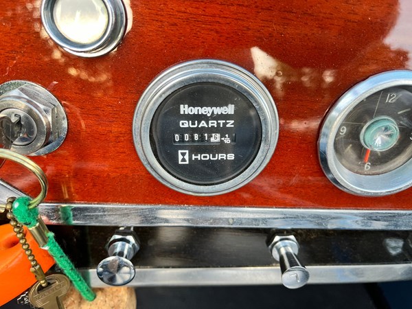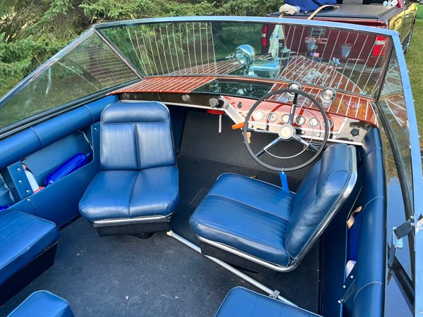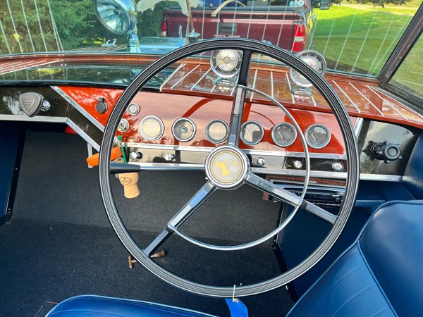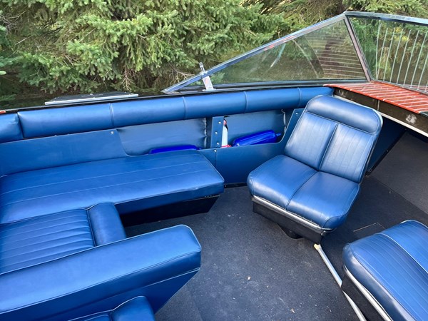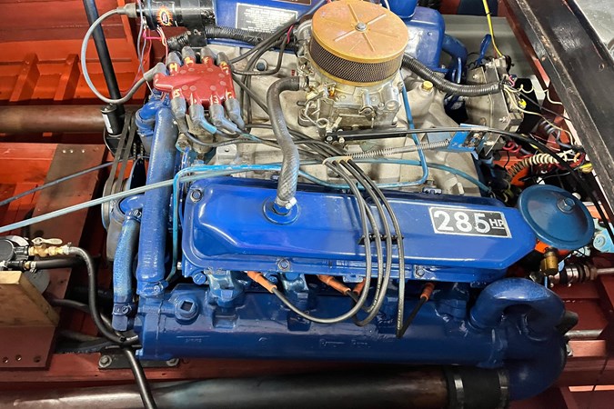 Mahogany decks, WEST system bottom, Interceptor 390/285 hp V-Drive, saddle tanks, cool hydraulic lift on engine hatch, correct replacement interior, both in color and Century-original details. Hardware is present for factory optional convertible top, although the top is not present. Well balanced single axle trailer, and mooring cover are included.
