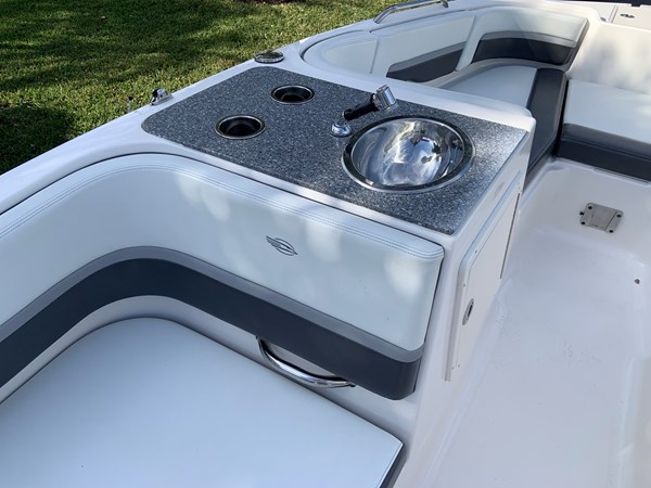 This particular 191SC has been stored inside since new. Has multiple covers to keep it that way. It has been given the best of care and maintenance. Loaded with extras and very low hours. This is very rare find. It is the very high end of any 20’ Deck boat you have ever seen. It has the spaciousness of a pontoon boat with the performance of a sport boat. It is a very big 20’ boat with lots of seating. Would make an excellent tender to a yacht as well.