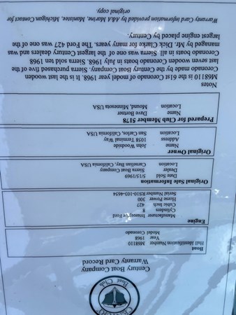 The very last wood Coronado to come off the line at Century, verified by the Century Club (see documents at the end of photos). Largely original, we rebuilt the original 427/300 hp Ford Interceptor, which has about 20 hours accrued. Hour meter shows 370 hours total on the boat, probably correct. New correct interior, varnish and bottom paint refreshed last fall. When Century announced they were discontinuing wood boat production, Sierra Boat on Lake Tahoe said they’d take all remaining Coronado’s, but they had to be hardtops. Century must have had some leftover black hardtops from 1965-67 production, as the 1968 hardtop was tan like the decks. This black hardtop is verified original by the Century Boat Club, as well.