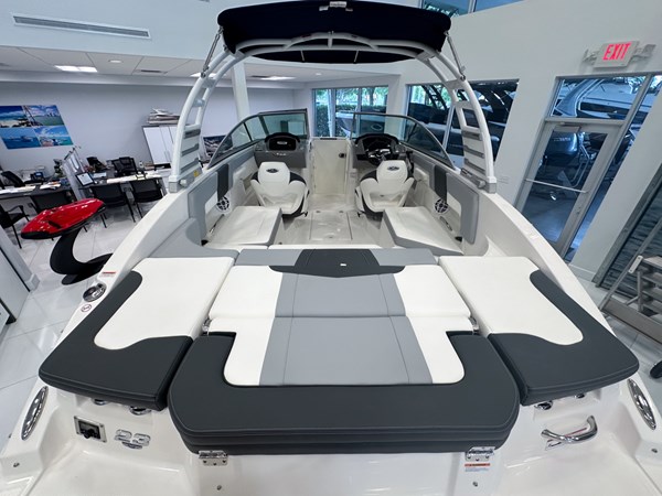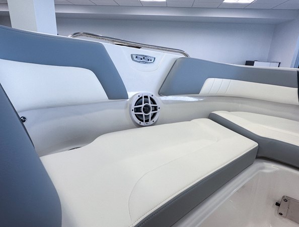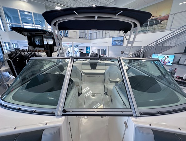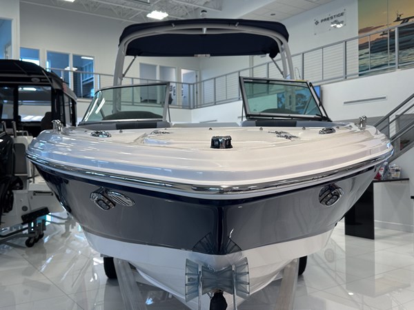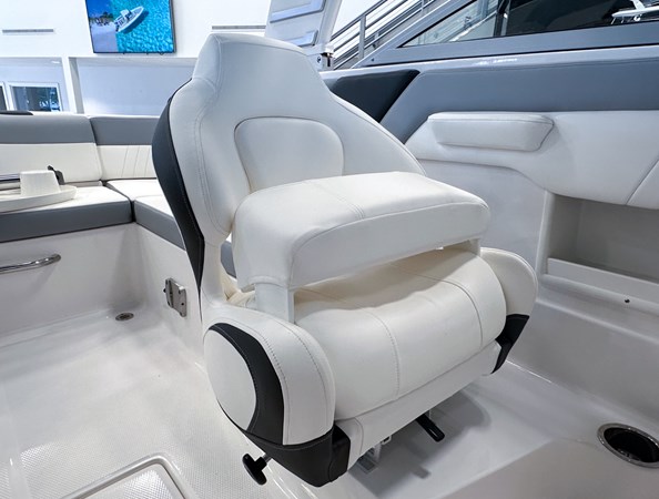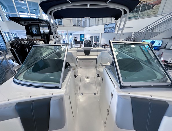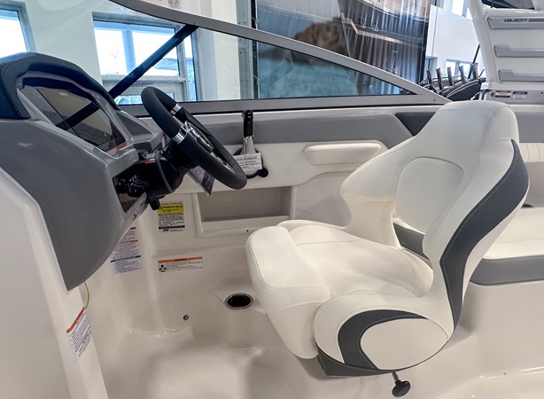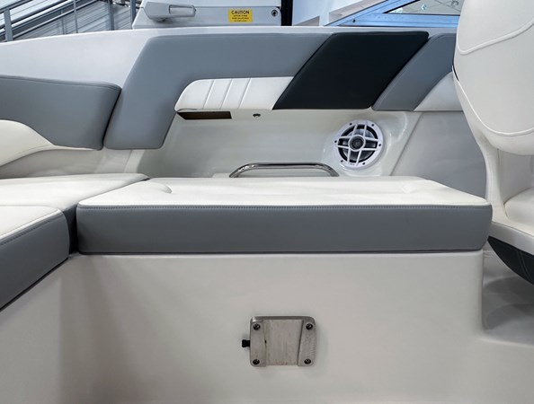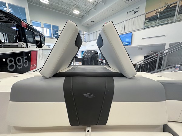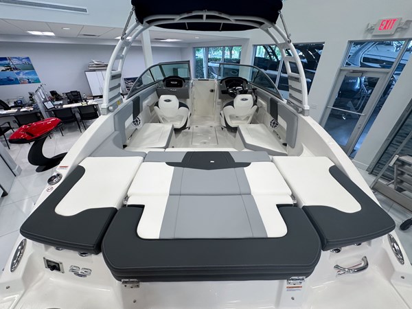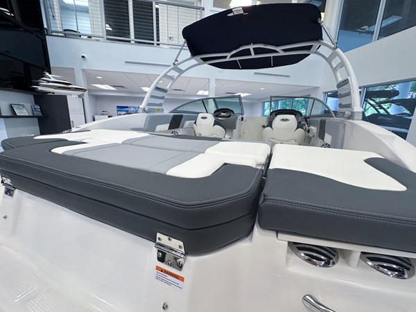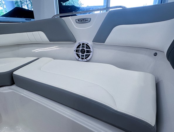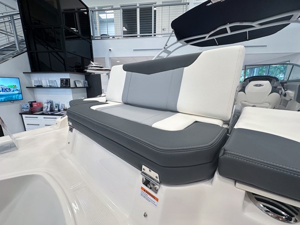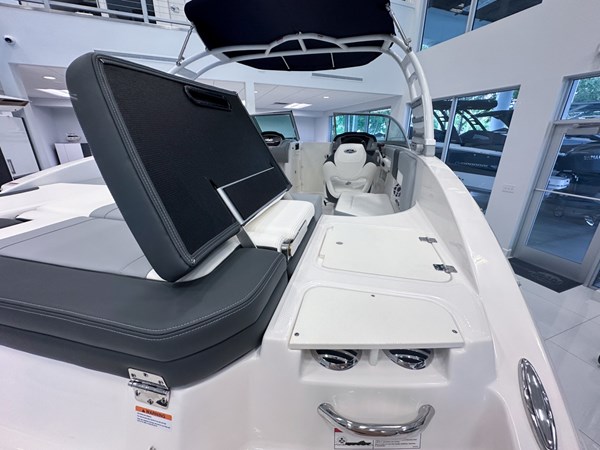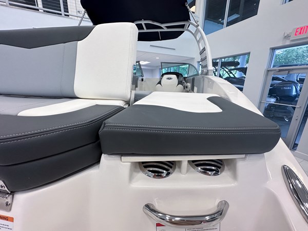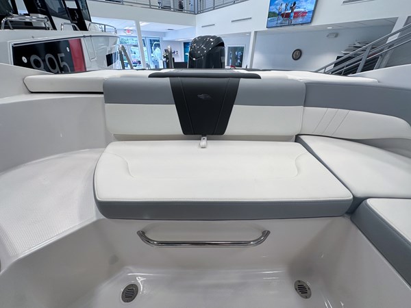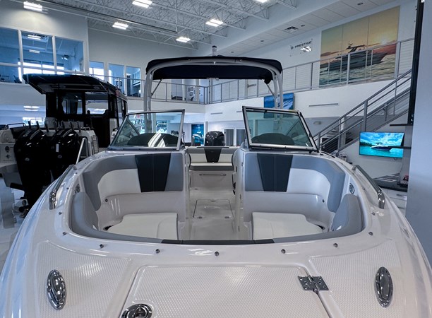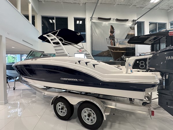 The 2024 Chaparral 23 SSi OB is a versatile and stylish 23-foot bowrider designed for both performance and comfort on the water. With a beam of 8’6″ and a dry weight of approximately 3,400 lbs, it offers ample space and stability for up to 13 passengers. The boat is powered by a single Yamaha F200XC 250 HP four-stroke outboard engine, ensuring quick planing and efficient cruising. Standard features include a 56-gallon fuel tank, a 70-quart built-in cooler under the rear bench seat, and a cockpit drainage system (CDS). The cockpit layout boasts two ultra-comfortable bucket seats with flip-up bolsters, U-shaped seating, and an aft hinged sundeck with walk-thru and lounge position.