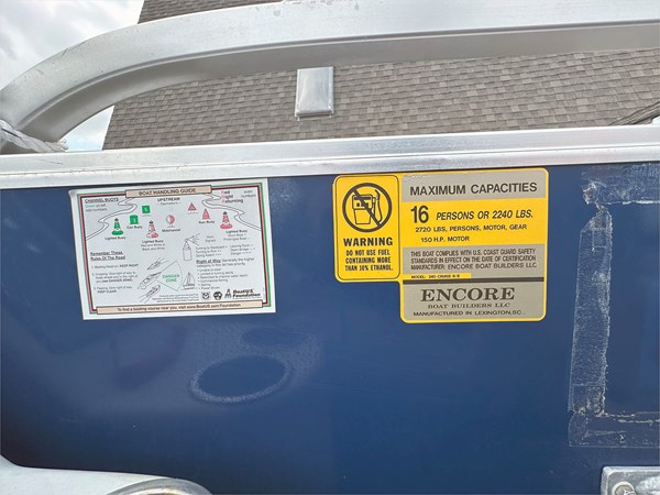 It’s reported from the donor that this 2017 Encore Bentley 240 Cruise SE is a solid, dependable pontoon that shows well for its year. Like any boat of its age, it has some character—there are a few tears on the back top cushions, minor stitching wear, and the fence paneling and pontoons show typical signs of oxidation—but nothing that affects its performance or fun on the water. A thorough cleaning will really make her shine!