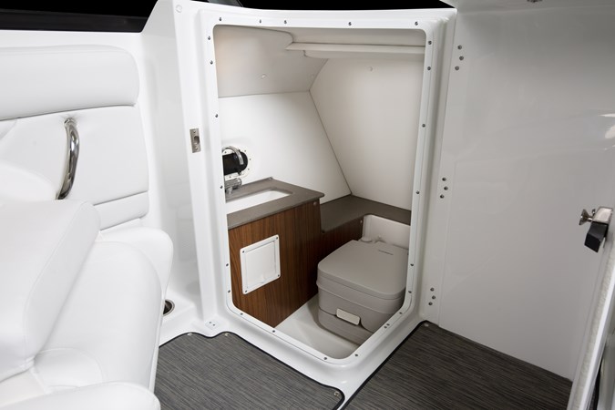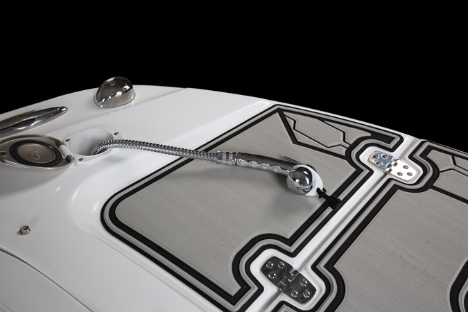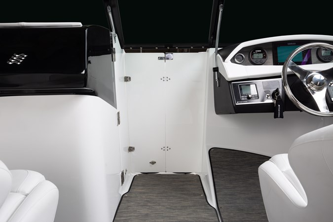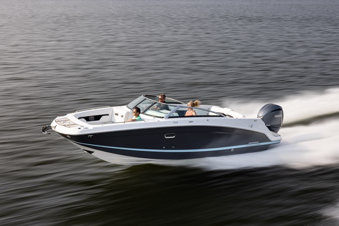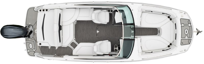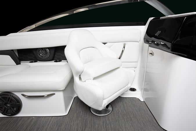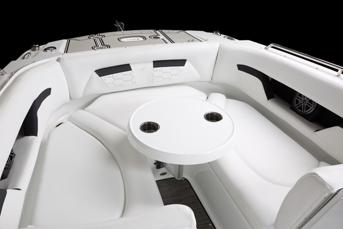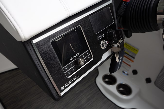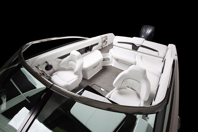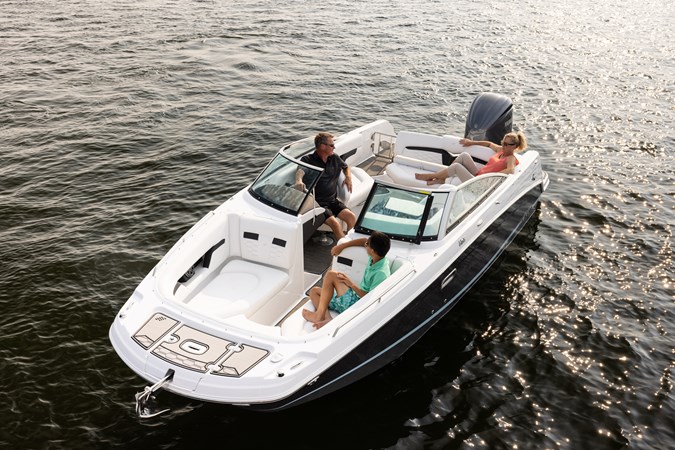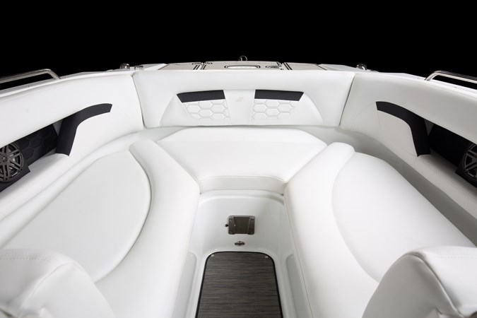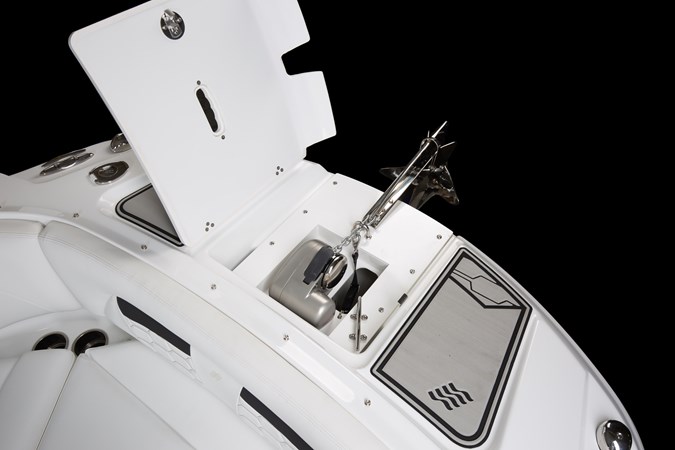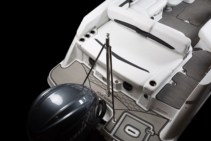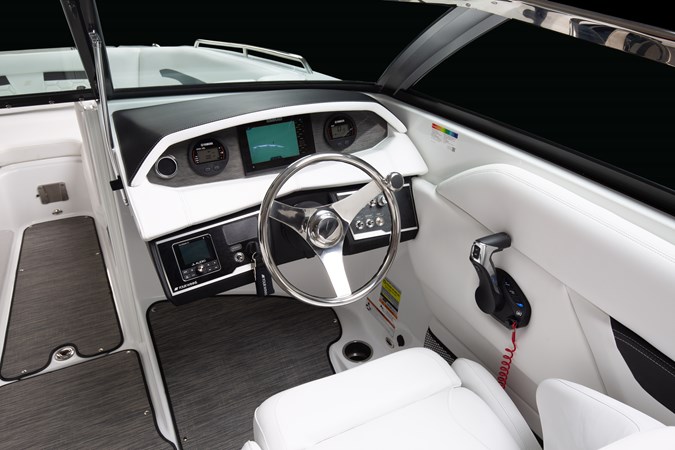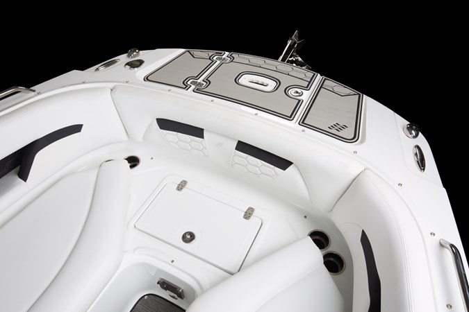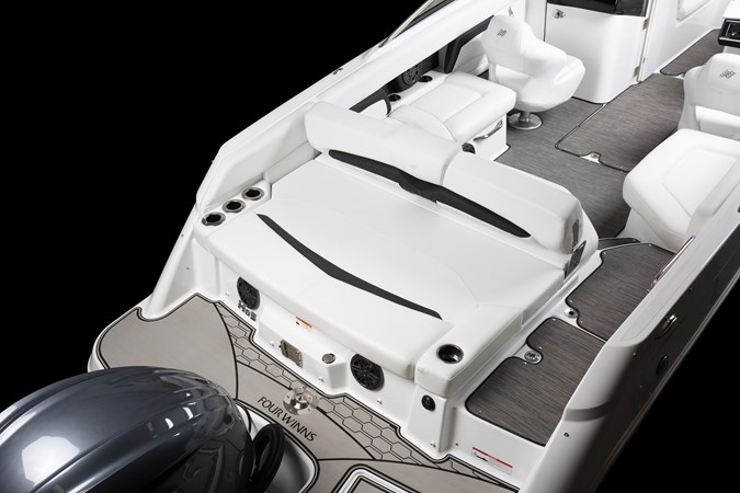 The 2025 Four Winns HD5 OB is a luxurious 24’4″ bowrider that combines classic styling with modern performance, accommodating up to 13 passengers. It features a spacious U-shaped cockpit with premium contoured upholstery and a convertible aft sun lounge, providing ample seating and relaxation areas. The boat is equipped with a fully enclosed head compartment, enhancing comfort during extended outings. The helm boasts a rich, hand-wrapped vinyl dash with custom detailing and LED accent lighting, complemented by fog-resistant gauges and a tilt steering wheel. For entertainment, the HD5 OB comes with a stereo system featuring AM/FM radio, Bluetooth connectivity, and USB ports. The boat’s design emphasizes both aesthetics and functionality, making it ideal for leisurely cruises and water sports activities.