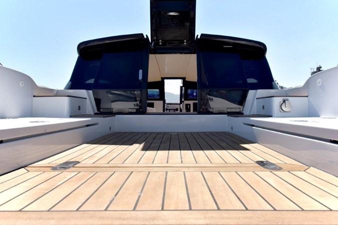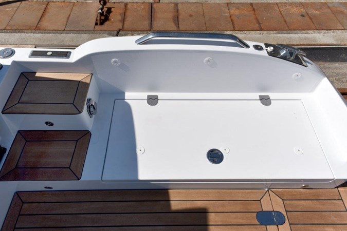 Forward and aft sliding glass access door to allow for easy access via the bow ramp or the aft platform. Teak-laid floors throughout with drainage.