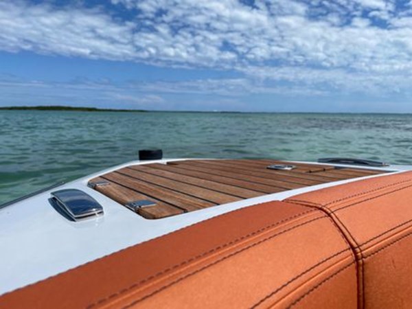 The bow deck comprises a lounge area with a floor on the same level as the cockpit. It can be easily and safely reached via an opening in the centre of the boat, even while the boat is moving. Two opposite facing sofas, on either wall, can be used either as seats or chaise-longues.
