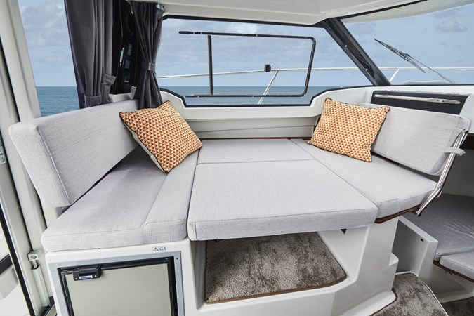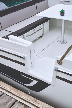 The 2025 Jeanneau NC795 S2 is a modern 26-foot cabin cruiser designed for year-round coastal adventures, blending comfort, versatility, and stylish design. With a beam of 9′ 3″ and a dry weight of approximately 5,236 lbs, it offers a spacious and stable platform for cruising. Powered by a Mercury 225XL DTS 4-stroke outboard engine, making it suitable for both day trips and extended outings. The boat features a hardtop with an opening skylight, panoramic windshield, and an aft sliding cabin door, enhancing ventilation and providing a 360° view. Below deck, the cabin includes a salon dinette that converts into a berth, an enclosed head, and an on-deck galley, offering amenities for overnight stays.