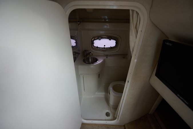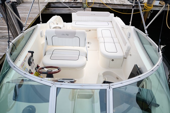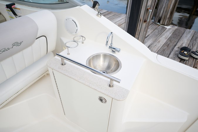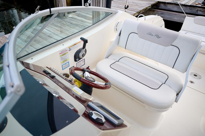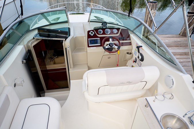 Below deck, the interior showcases Sea Ray’s signature fit and finish with a bright, inviting cabin. The layout includes a convertible V-berth/dinette forward , a mid-cabin sleeping area , and accommodations for up to four guests . The galley is well equipped with an Isotherm refrigerator , Kenyon cooktop , microwave , sink, and ample storage—ideal for overnight trips and weekend cruising.