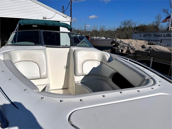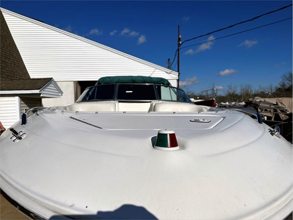 The dash area’s enclosed head is on the port side. With a 310 horsepower Mercury engine that starts easily, the boat operates effectively.