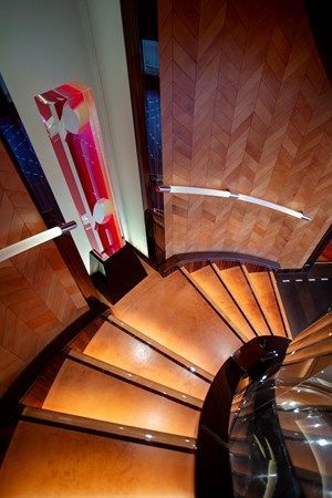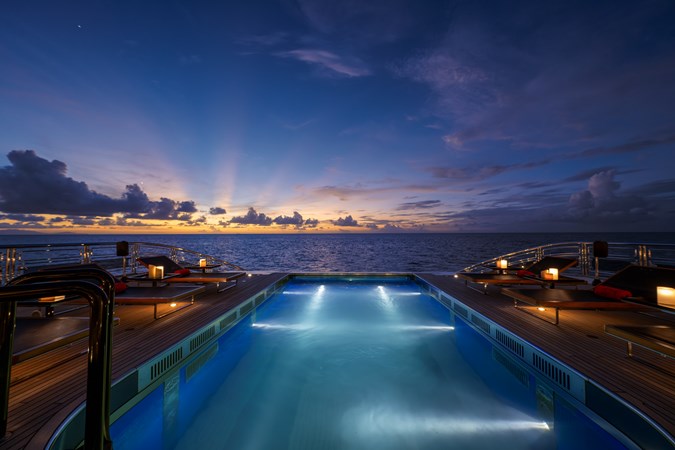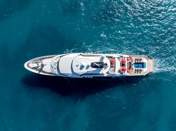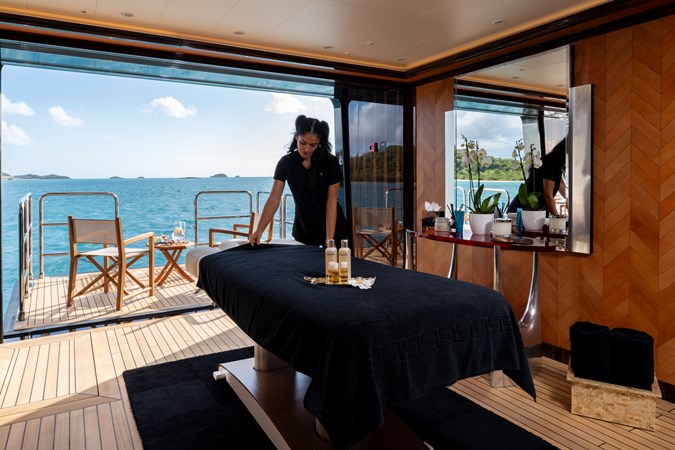 The aft deck is one of ALFA NERO’s most distinctive features. She was the first yacht to feature an infinity pool with a glass waterfall side. When the pool is drained, its floor can be raised to sit flush with the deck, creating a large open-air entertainment space. The area is complemented by a full wet bar, generous banquette seating and plenty of space for alfresco dining or hosting large events.