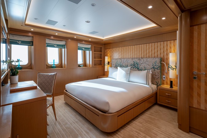 Her profile is instantly identifiable: a black steel hull contrasted with a light superstructure, low stern and minimal overhangs, a deliberate departure from the conventions of her time. At 82m (266’) and with 1,250m² (13,455ft²) of living space, she offers impressive volume and refined proportions.