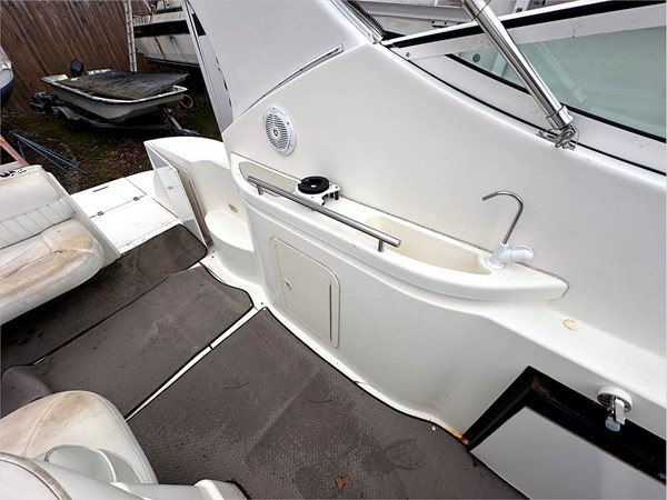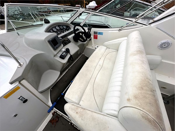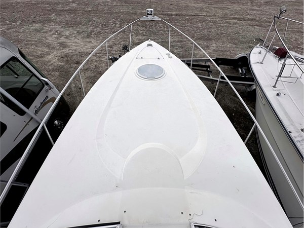 The 3075 Express is a distinctive boat known for its sleek design that hides its high freeboard. It offers modern styling and luxurious amenities typical of late-model Cruisers yachts. This family cruiser features a conventional midcabin layout with double berths in the front and back, a small galley, and a convertible dinette. The spacious head compartment is conveniently located near the companionway steps.