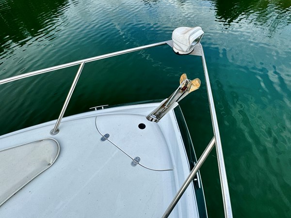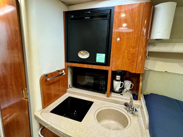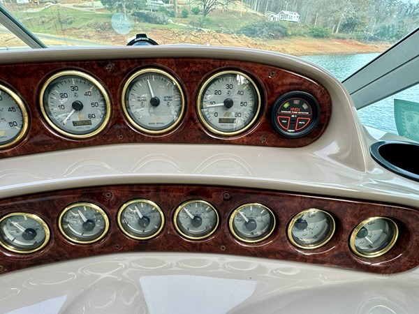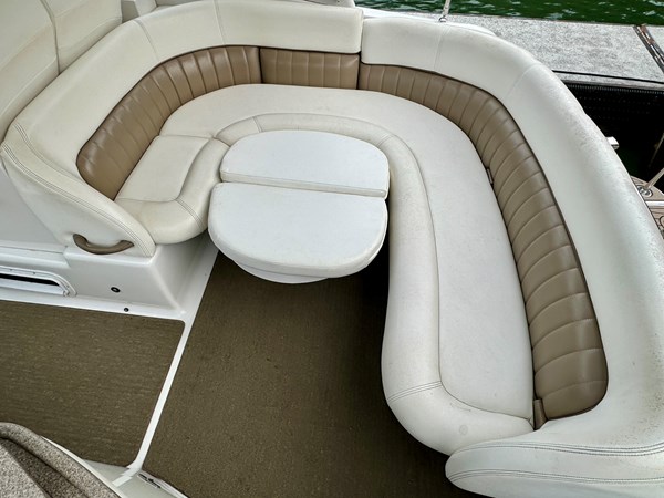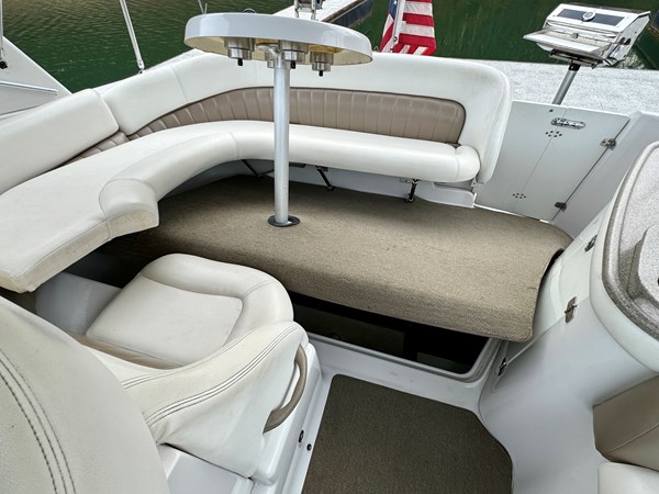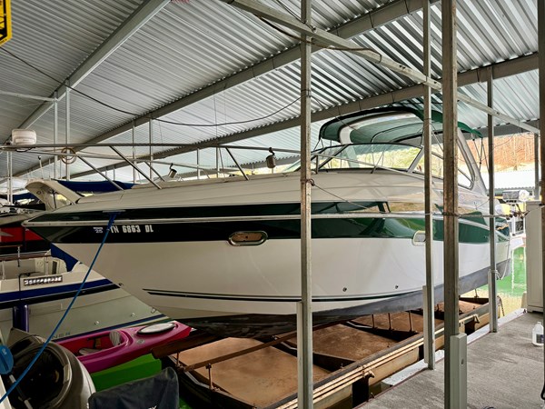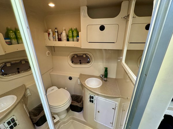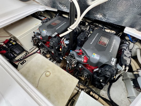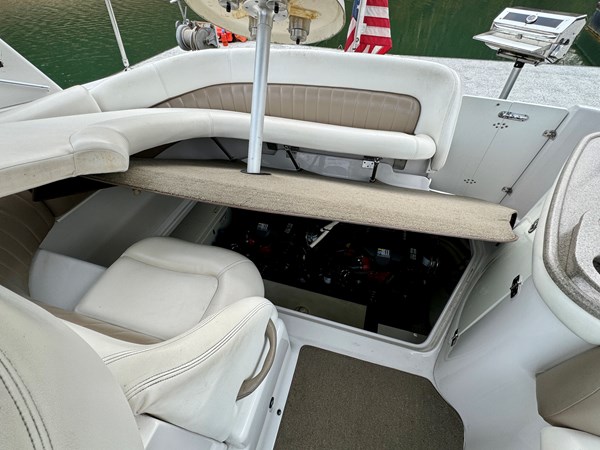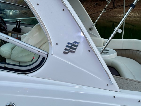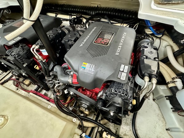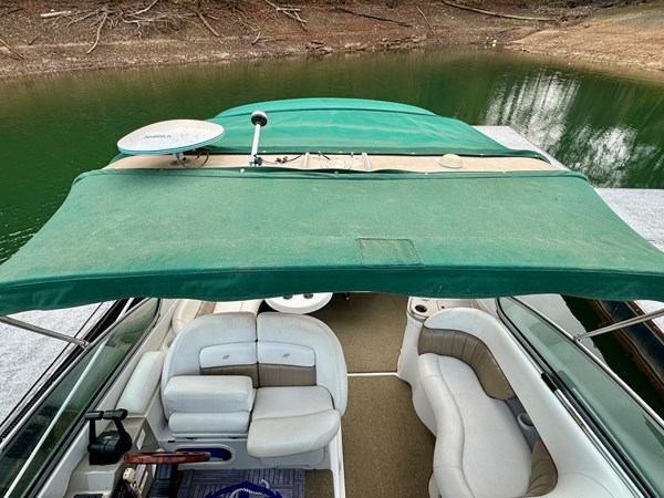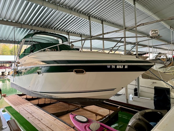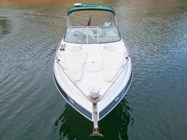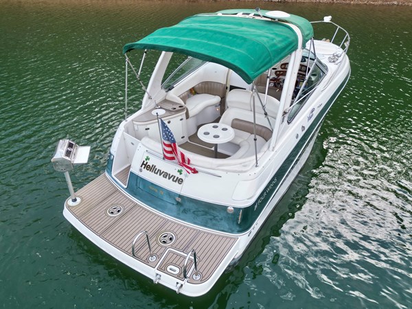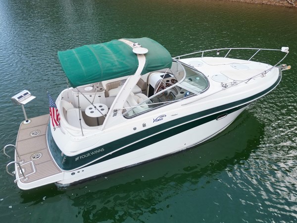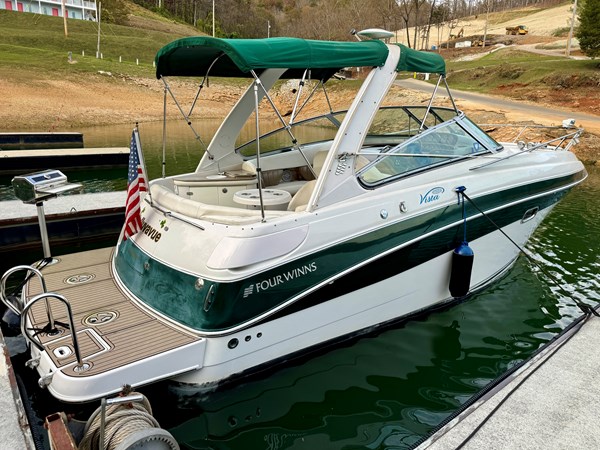 This Fresh Water 2004 Four Winns 288 Vista Cabin Cruiser For Sale on Norris Lake Tennessee is equipped with twin Volvo Penta 5.0GXi fuel injected 270HP V8 inboard/outboard engines with DuoProp outdrives and features a convertible V-berth dinette, a separate dinette, and a mid-cabin berth to sleep 4, a vaccuflush wet head and shower, a galley with DC fridge, microwave, single burner electric range cooktop, integrated waste bin, and sink, a pair of TV/DVD players, AM/FM/USB/Aux input/Bluetooth stereo with cockpit and cabin speakers, marine air conditioning with reverse cycle heat, dual bimini tops with a camper canvas/isenglass enclosure, bow cushions, a windlass anchor, remote spotlight, GPS/Chartplotter/depth/Fishfinder/sonar, a VHF radio, powered engine hatch, a 5.0Kw Generator in a sound box, Sea-Dek covered swim platform with a magma gas grill and a swim boarding ladder with handrails, and much more!
