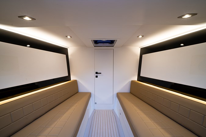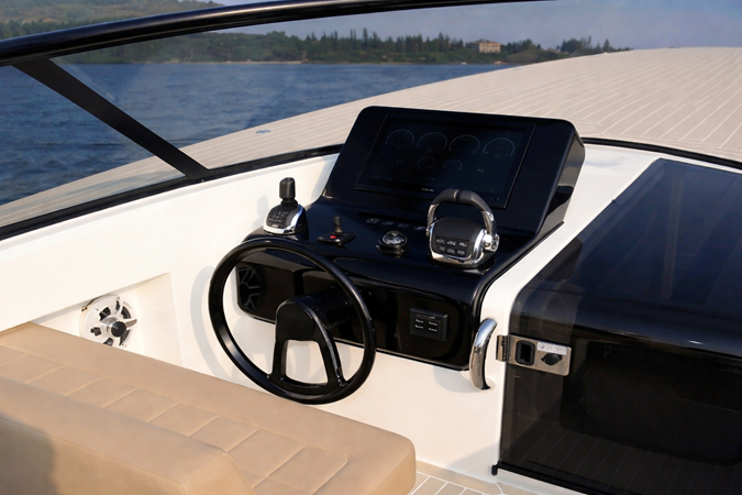 On board, you’ll find a spacious sunbathing area, a cockpit bar with sink, premium sound system, and a well-appointed cabin for privacy or overnight stays. Every detail is thoughtfully designed — from lighting to materials. located in Cervia, Italy. Powered by 2 x Volvo V6-280-CE gasoline engines. Length 32 ft / 9.81 m, beam 9.51 ft / 2.90 m, berths for 2, and capacity for 8 passengers.