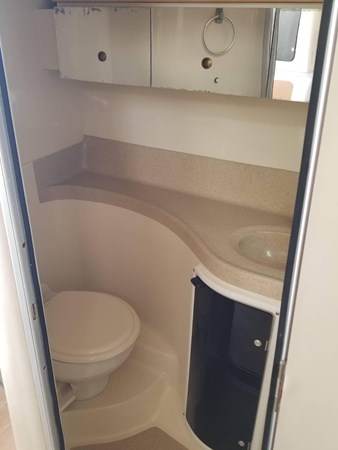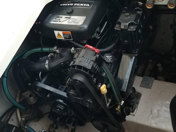 The vessel measures 32 feet 4 inches overall with a 10-foot 6-inch beam and has a draft of approximately 37 inches with drives down. It weighs approximately 11,500 pounds with engines. Powered by a total of 560 horsepower, this cruiser offers reliable performance and smooth handling.