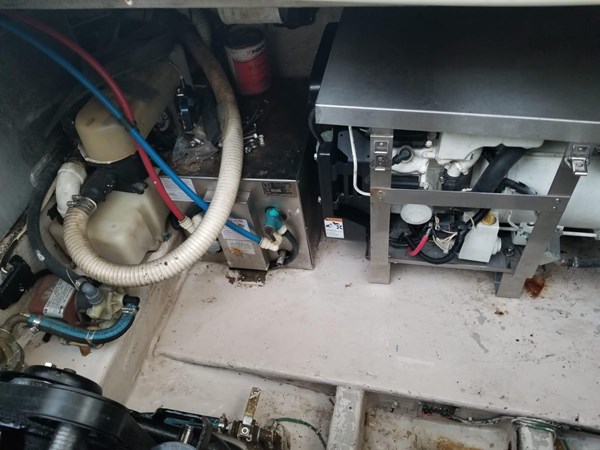 Fuel capacity is 160 gallons, with a 41-gallon water tank and a 20-gallon holding tank. The cabin offers accommodations for up to six people, along with a galley, enclosed head, and ample storage throughout. Bridge clearance with the radar arch is 8 feet 7 inches.