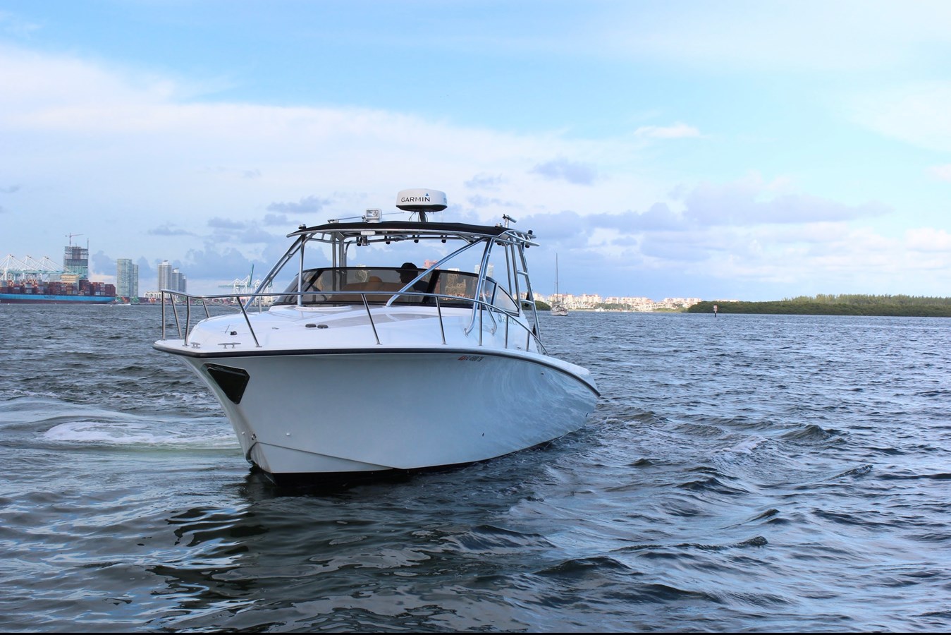 Take command of the Fountain 33 SFC with its center helm console, which provides a great view of your course, your wake, your cockpit, and your crew. The 33 SFC cockpit is arranged for serious fishing with lockable under-gunwale rod stowage able to stow a pair of 50s per side. The transom livewell is also smart, the lid has a small hatch to keep water from sloshing out, but the lid can also be removed entirely if you want to use the livewell as a fishbox if needed. There are also two massive, macerated fish that boxes reside in the sole. A rigging station is on the transom and at the cockpit’s forward end is another livewell and a tackle storage unit. These modules are the perfect height for crew to sit on and watch strikes.