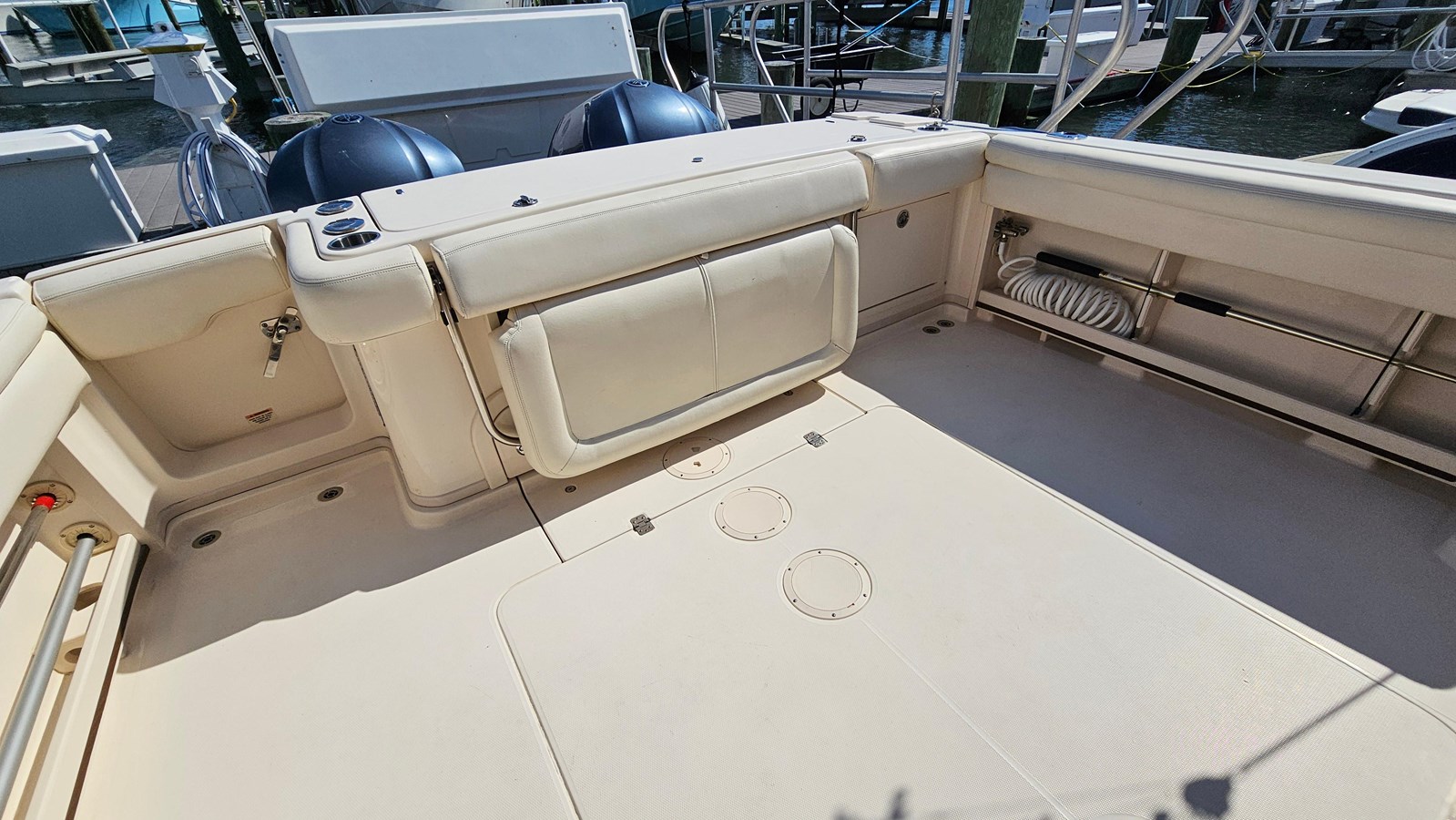 This boat is set up for offshore fishing. With its Lee triple spreader outriggers and center rigger. With a livewell and a sink in the forward port cockpit corners, a washdown and large fishbox at the transom, it’s all set up to take you to the canyon for tuna with its reliable twin Yamaha 300s (976 hours port, 969 hours starboard). There’s plenty of rod storage on this boat in rocket launchers around the back of the hardtop, under the gunnels and from the cabin headliner.