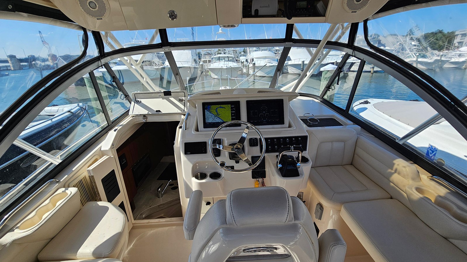 Make sure to use the twin engines, along with the Lewmar bow thruster to get your lines on the pilings and depart with ease. The twin Garmin GMap 7612xsv chartplotters, Garmin xHD2 radar with open array, Garmin autopilot, twin Garmin VHF 200s, FLIR thermal imaging camera and remote spotlight can aid in getting you out to the canyon or to your cruising destination.