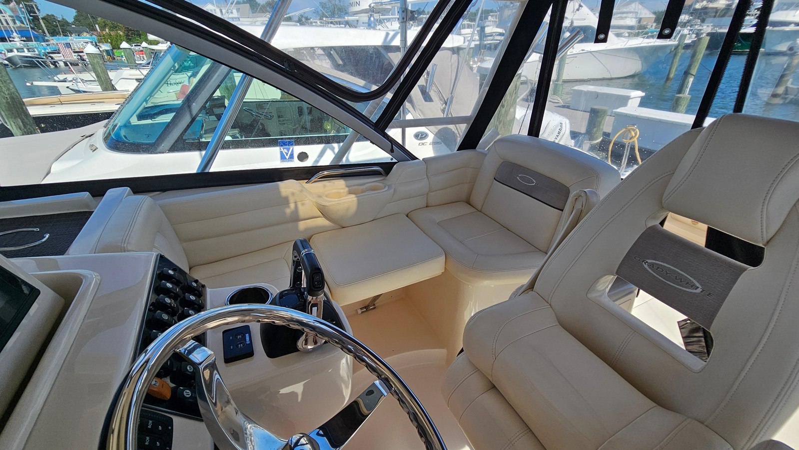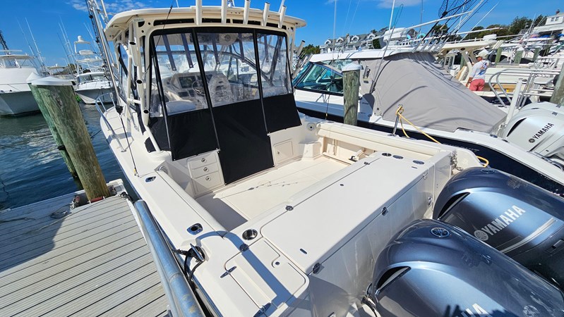 This Grady-White 330 Express shows the care and maintenance of a knowledgeable owner. Purchased in 2016 from its original owner, this boat has been used to create memories. It makes the perfect boat for fishing, cruising and dayboating. With its full helm enclosure, helm and cabin air conditioning and heat, and its Fischer Panda 4Kw diesel generator (413 hours), this can easily become a three season boat in the Northeast and Mid-Atlantic. The cockpit is spacious with high gunnels, transom seating, a large starboard side transom door, and steps up to the side decks to get to the bow with plenty of grab handles along the way. The bow offers a large platform with high rails to take in the sun or drop the anchor with the electric Lewmar windlass making this work easy.