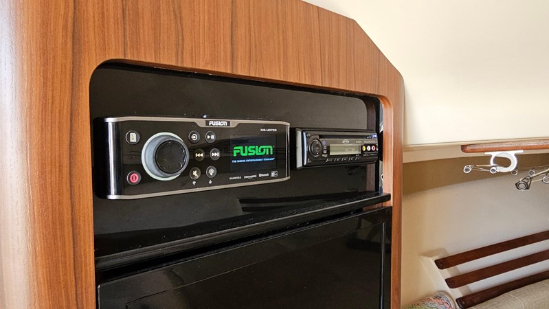 Down below, there’s a full galley with microwave, refrigerator and double burner electric stove to store and prepare your meals while away. With sleeping accommodations for 4-6 people, there’s enough room for your crew. Don’t forget the large, standup head with Vacuflush toilet and shower.