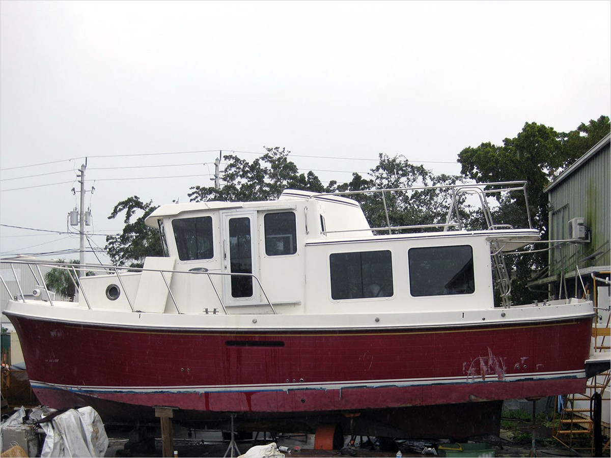 This American Tug took on water during a hurricane. It is reportedly structurally sound but will need repair to the swim platform, exterior gelcoat, topsides, interior cabinetry, and mechanicals installed.