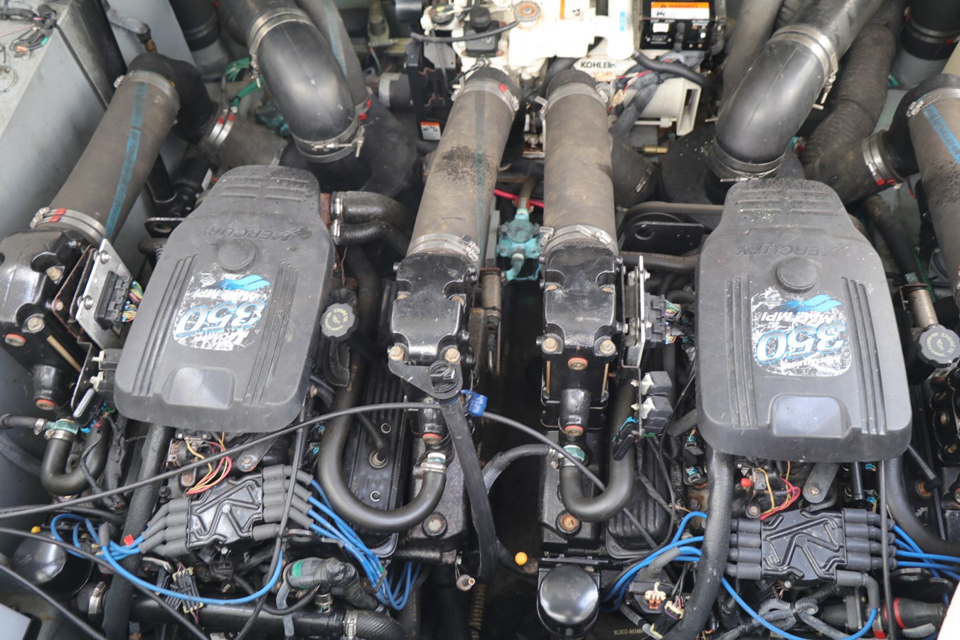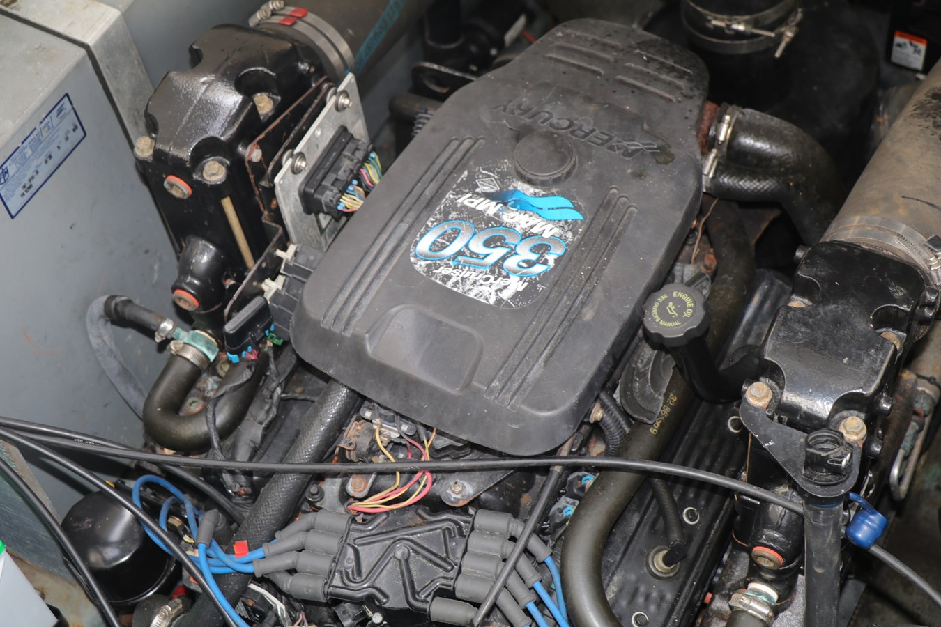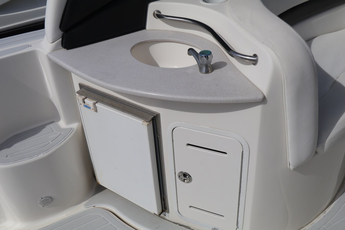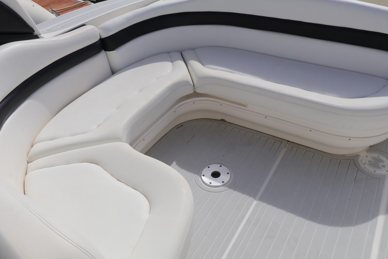 In the cockpit, the 320’s U-shaped aft lounge comes with a removable cocktail table. The cockpit sole lifts at the push of a button for access to the engines. This 320 Sundancer is powered by twin MerCruiser 350 MAG MPI 300 Hp engines.