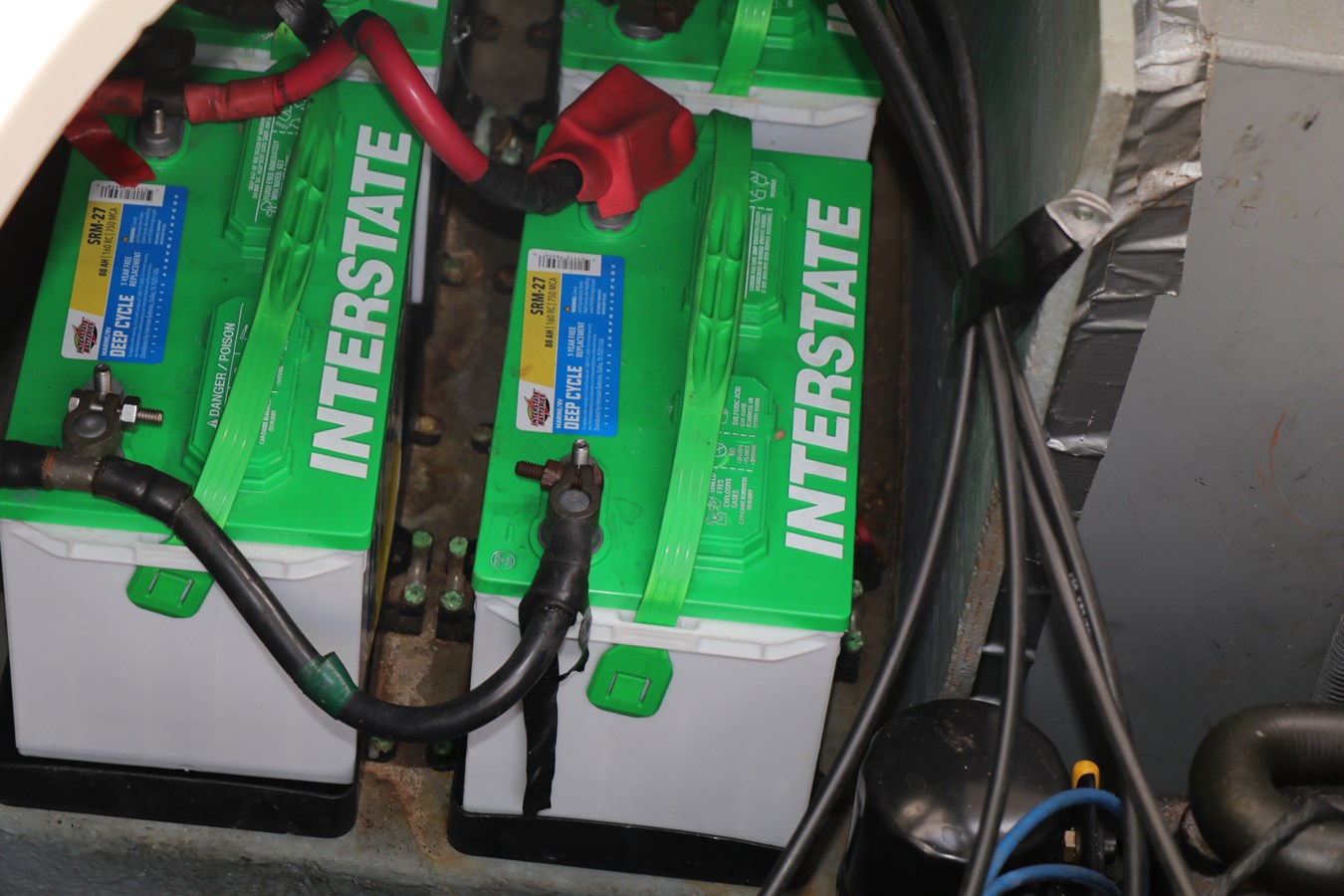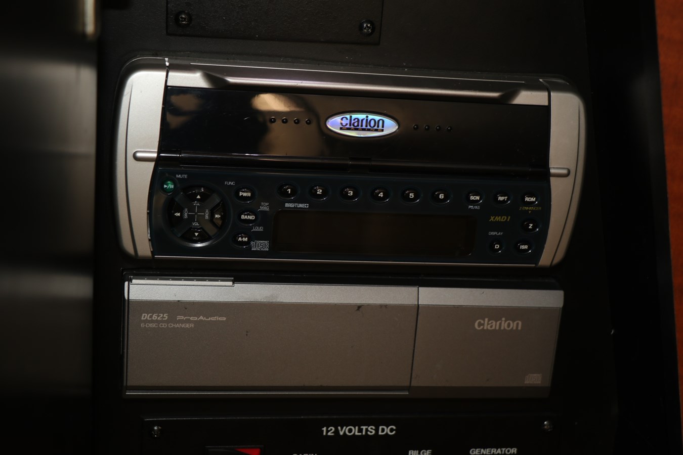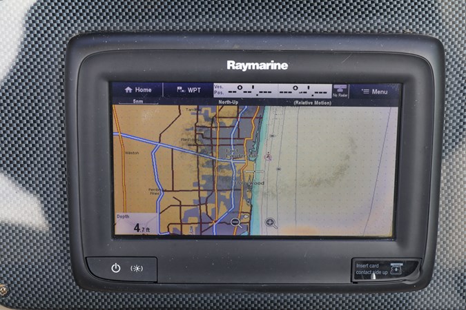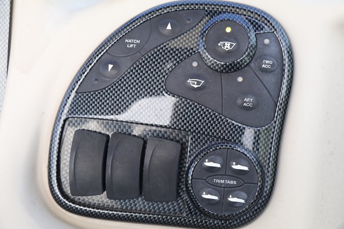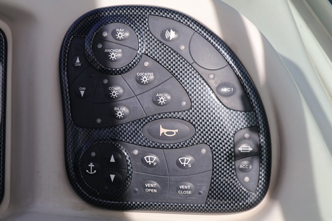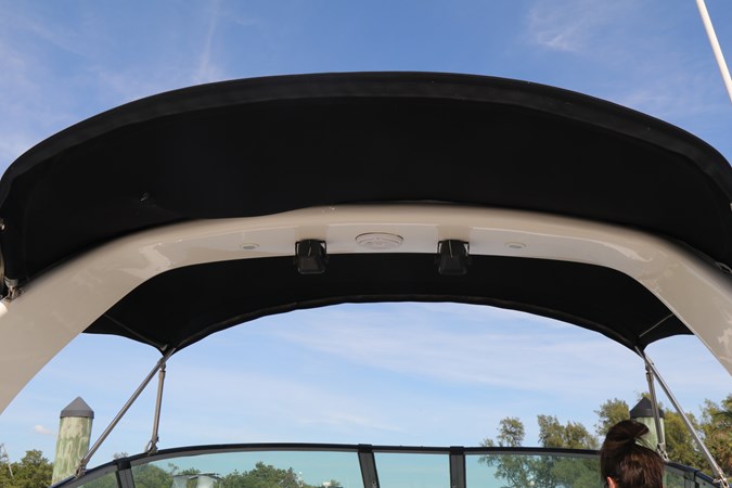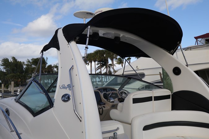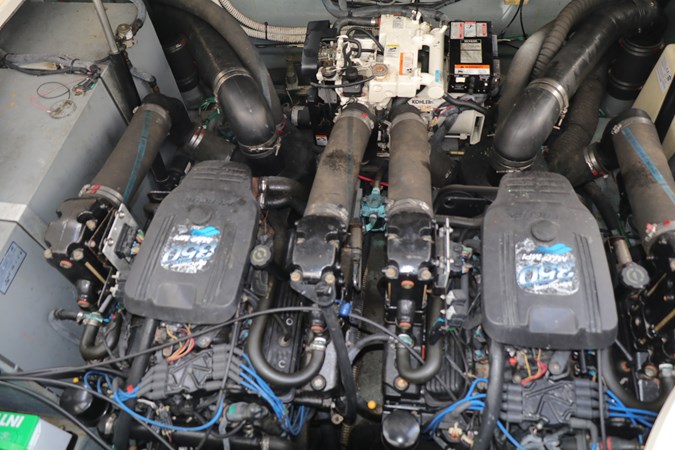 In the cockpit, the 320’s U-shaped aft lounge comes with a removable cocktail table. The cockpit sole lifts at the push of a button for access to the engines. This 320 Sundancer is powered by twin MerCruiser 350 MAG MPI 300 Hp engines.